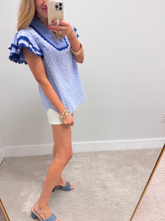 Blue Eyelet Flutter Sleeve Blouse
