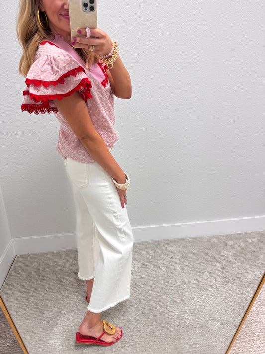 Red Eyelet Flutter Sleeve Blouse