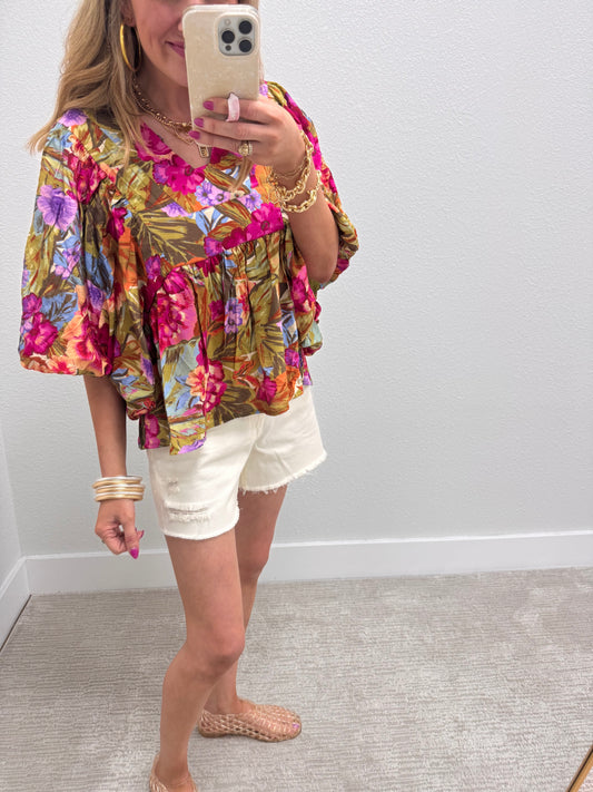 Olive Floral Print Bubble Sleeve Top with Plunge Neck & Tie