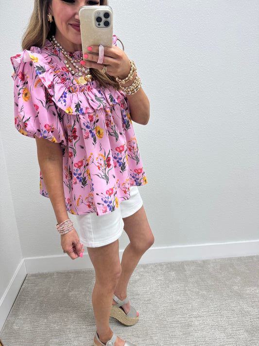 Pink Floral Print Smocked Top Ruffle Sleeve