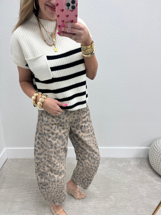 Ivory & Black Stripe Crop Short Sleeve Sweater Top