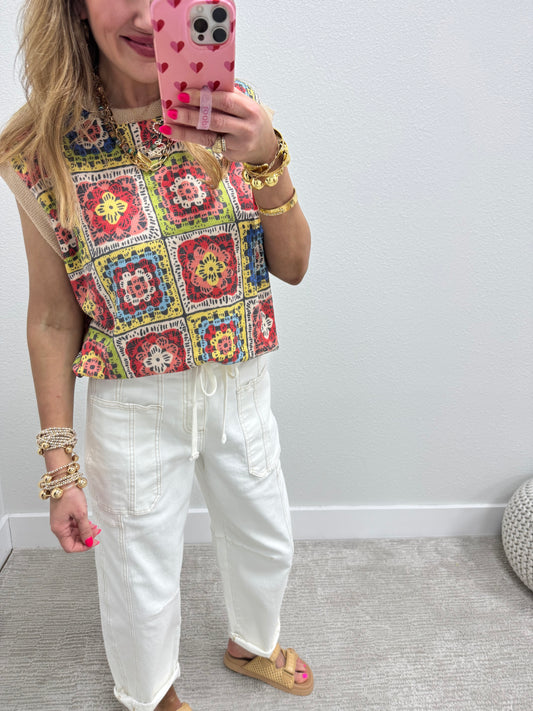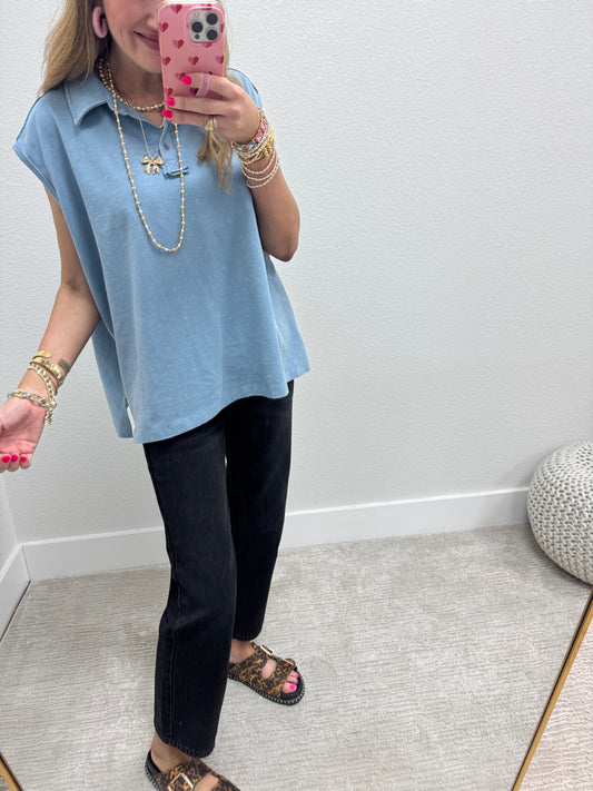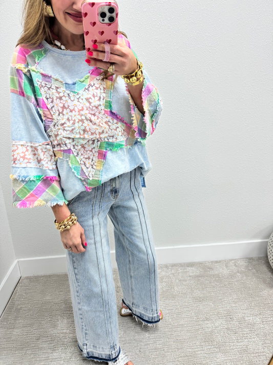 Sky Blue Star Detail Oversized 3/4 Sleeve Top