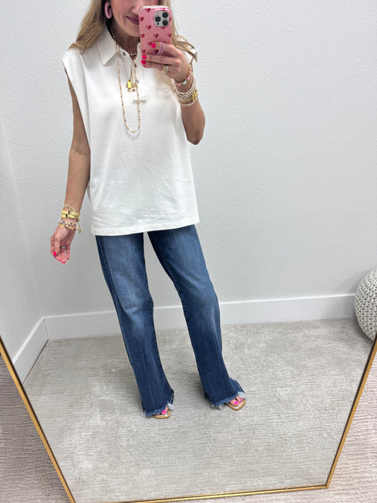 Pearl Detail Washed Denim Crop Vest with Ruffle