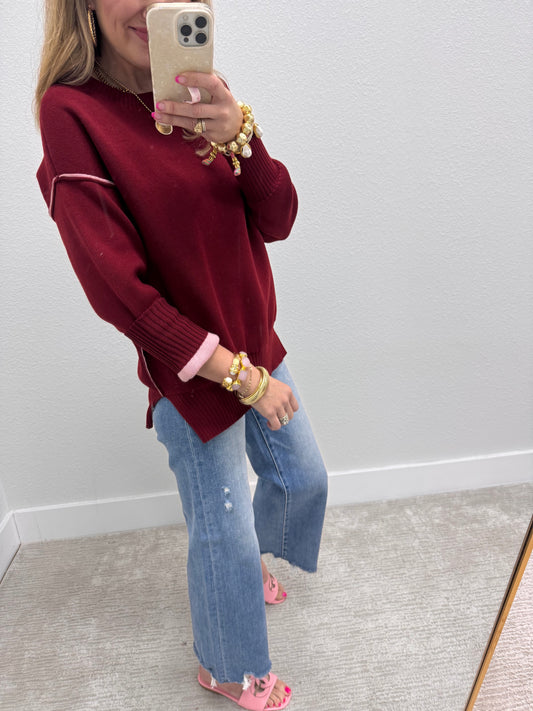 Burgundy & Pink Round Neck Contrast Trim Sweater