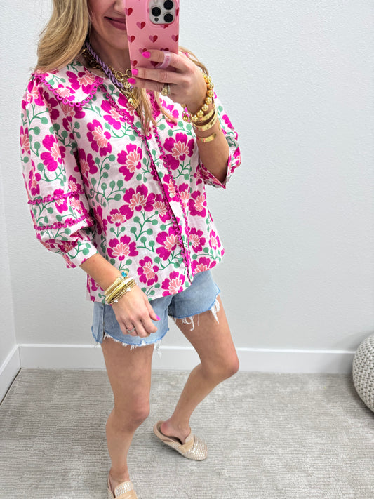 Pink and White 3/4 Scallop Trim Floral Top