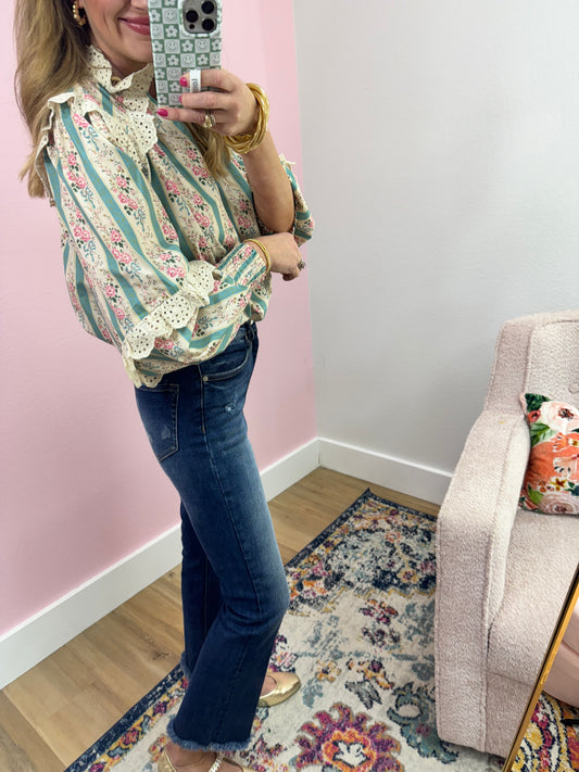 Turquoise and Cream Eyelet Neck Top