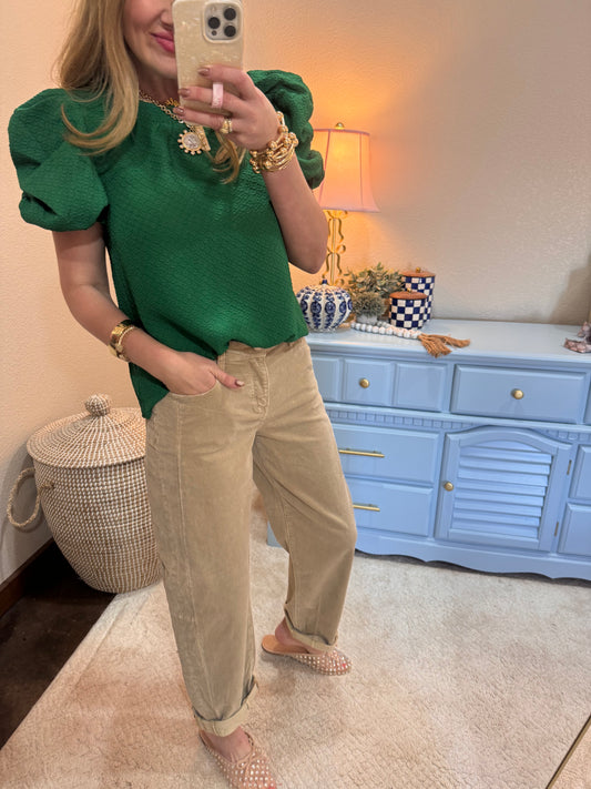 Cream Colored Collar 1/2 Zip Puff Sleeve Top