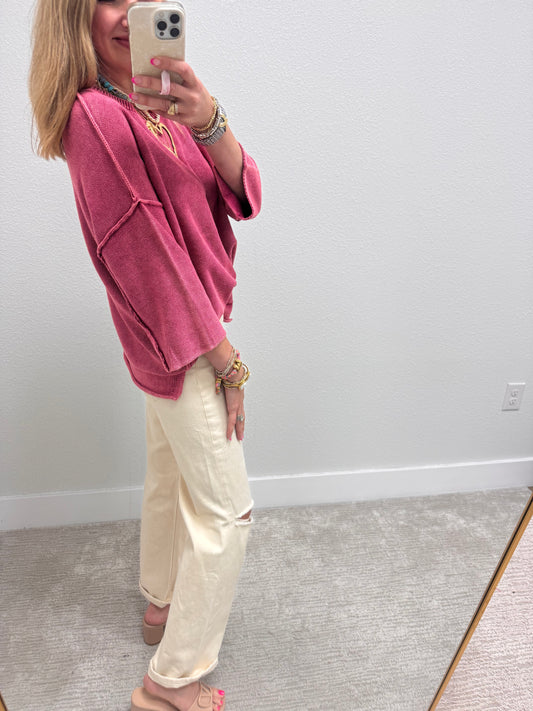 Cabernet Washed 3/4 Sleeve Boxy Sweater
