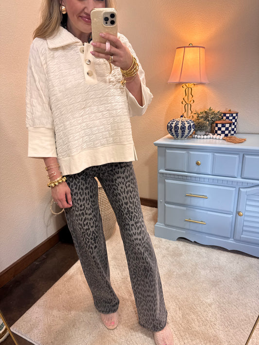 Ivory Quilted 3/4 Sleeve Top with Button Detail