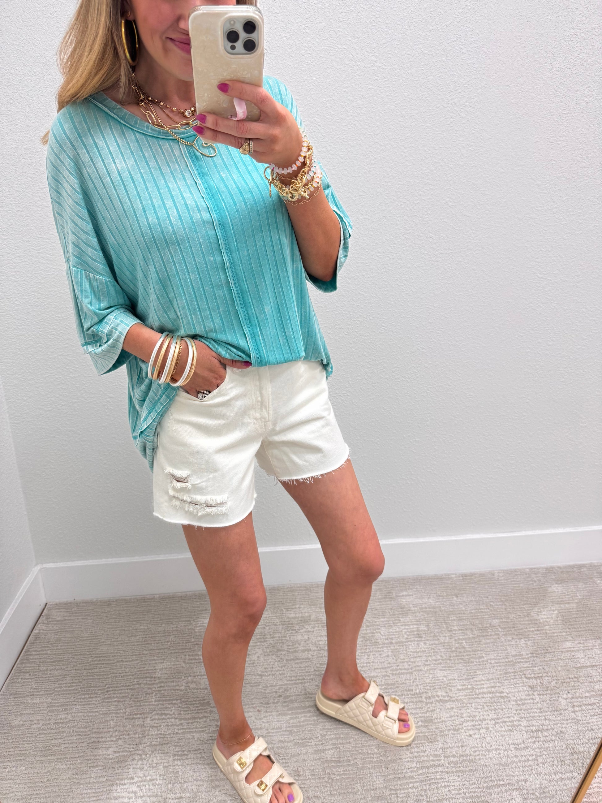 Turquoise Ribbed Drop Shoulder V-Neck Dolman Top