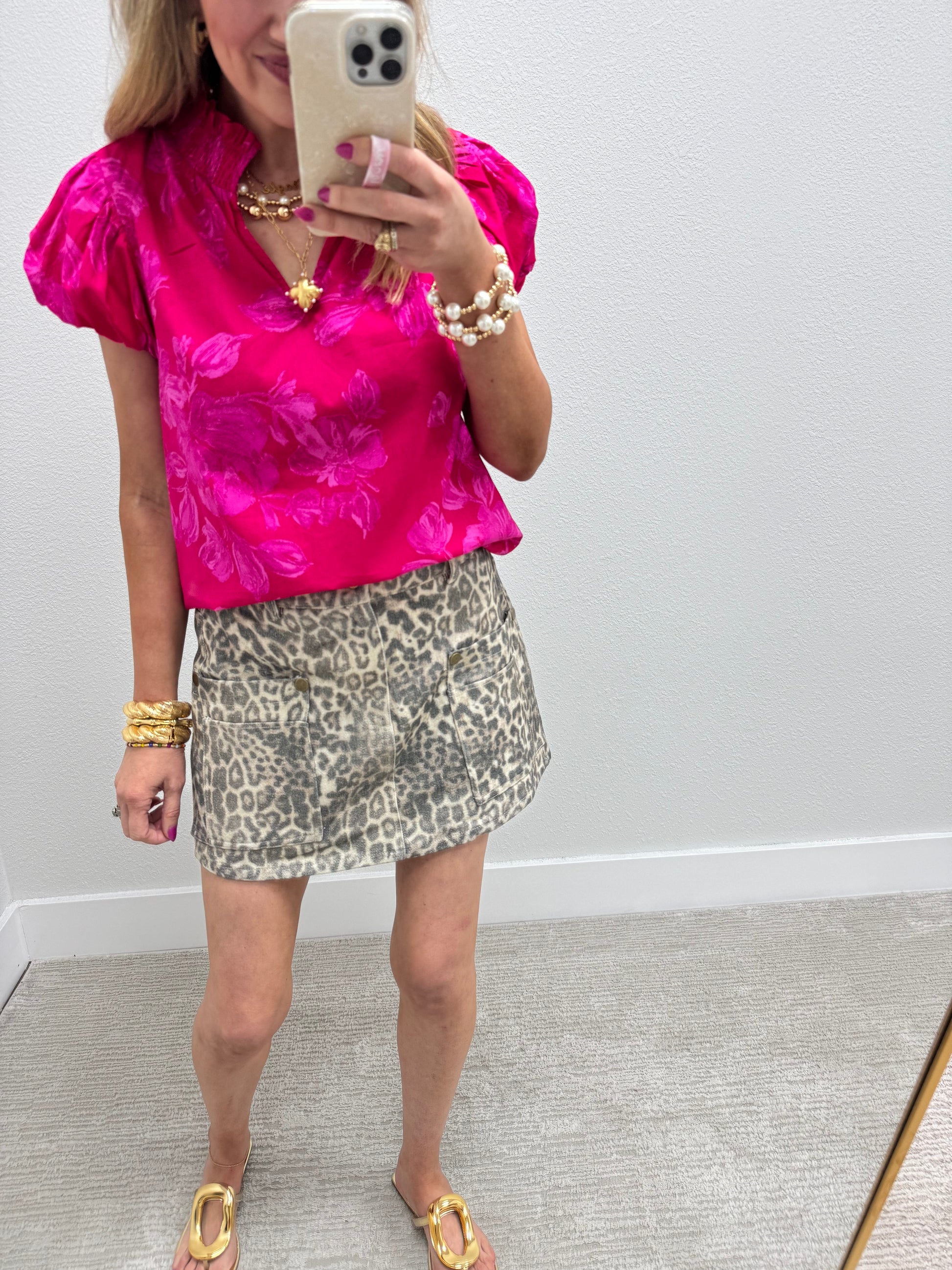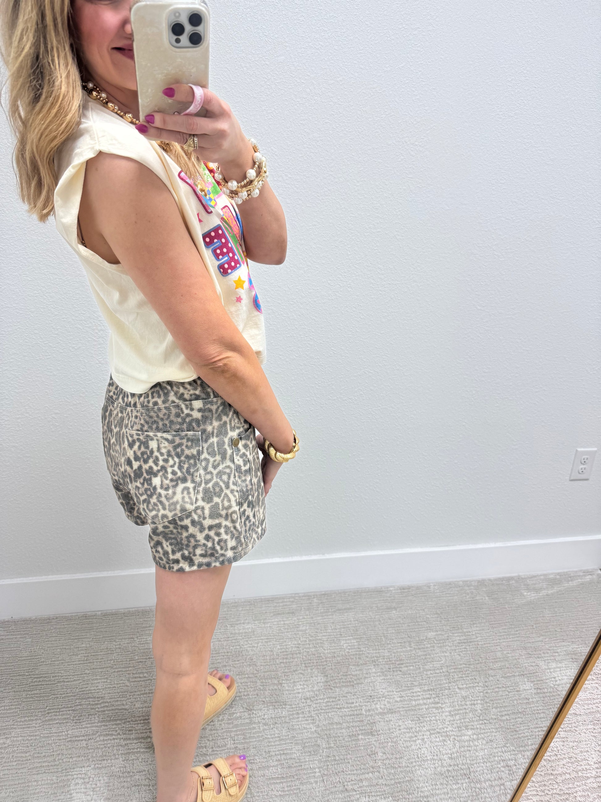 The cutest little leopard denim skort!! Sooo cute for graphic tees or more dressy tops or all of the above. Love it, relaxed fit and elastic in the back. Macy is a 2/4 and 5’7 wearing the small