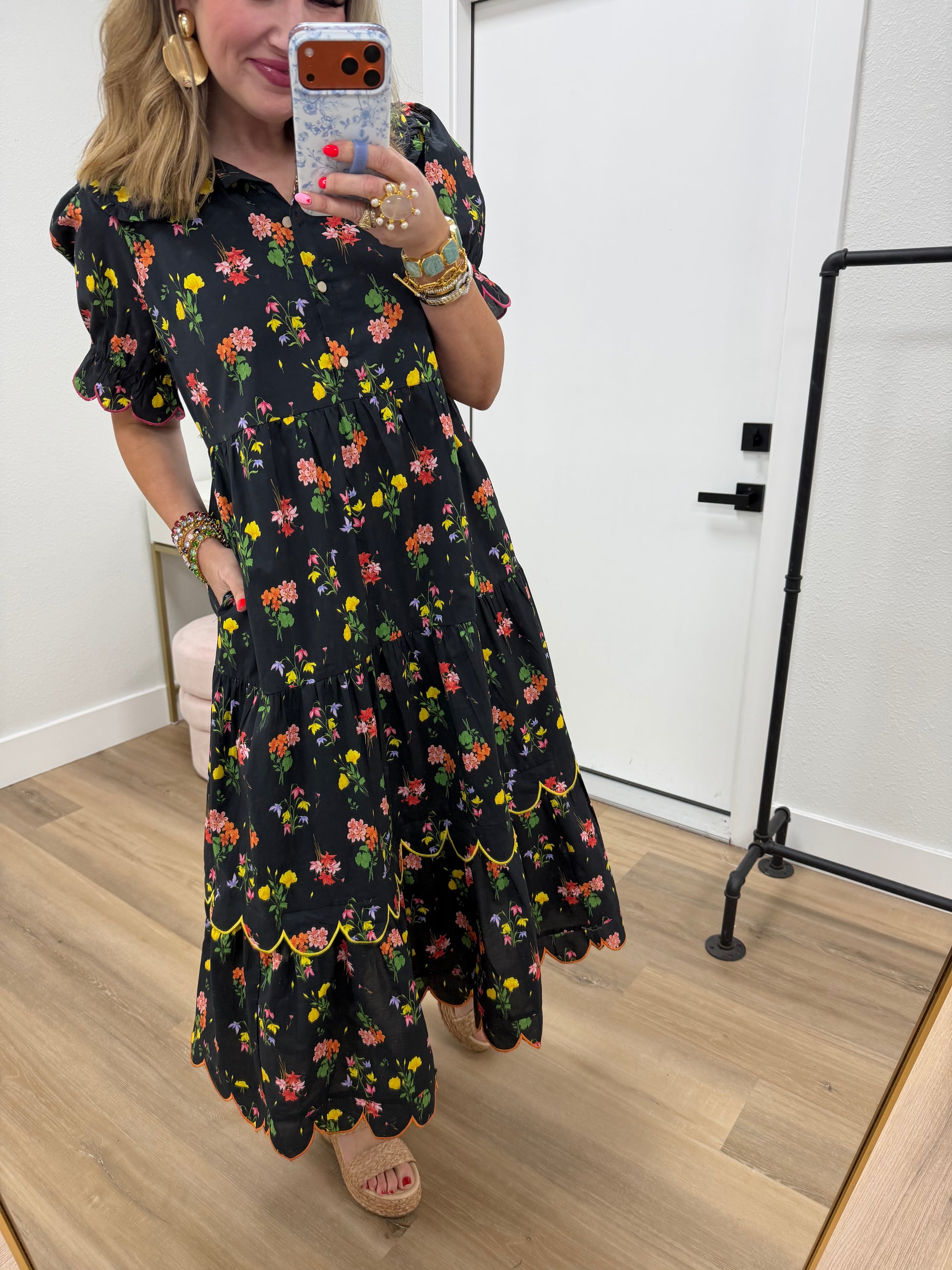 Black Floral Ruffle Collar Decorative Button Down Dress