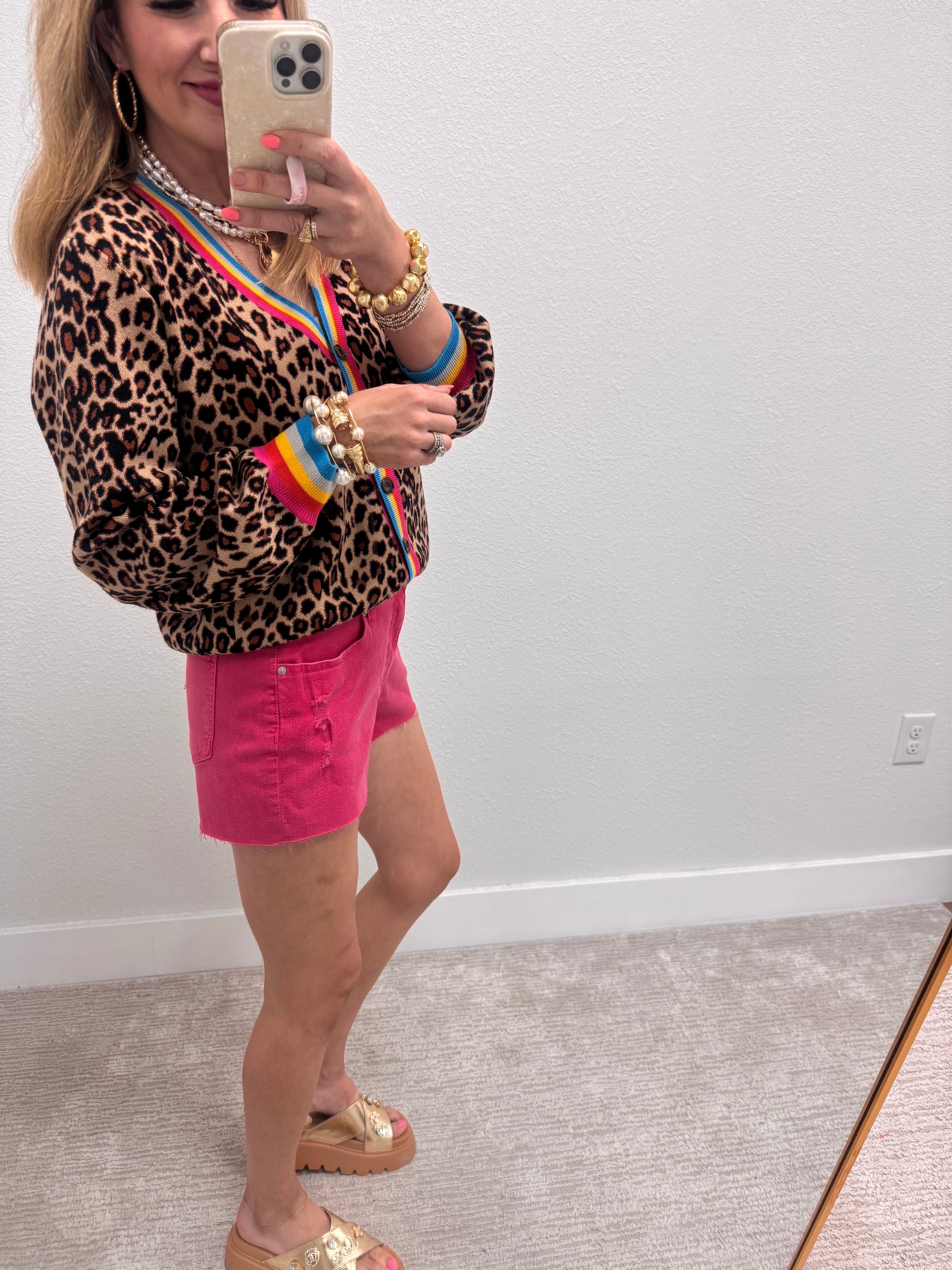 SO cute!!! The colored and leopard combo is adorable. Relaxed fit with stretch. Macy is a 2/4 and 5'7 wearing the small