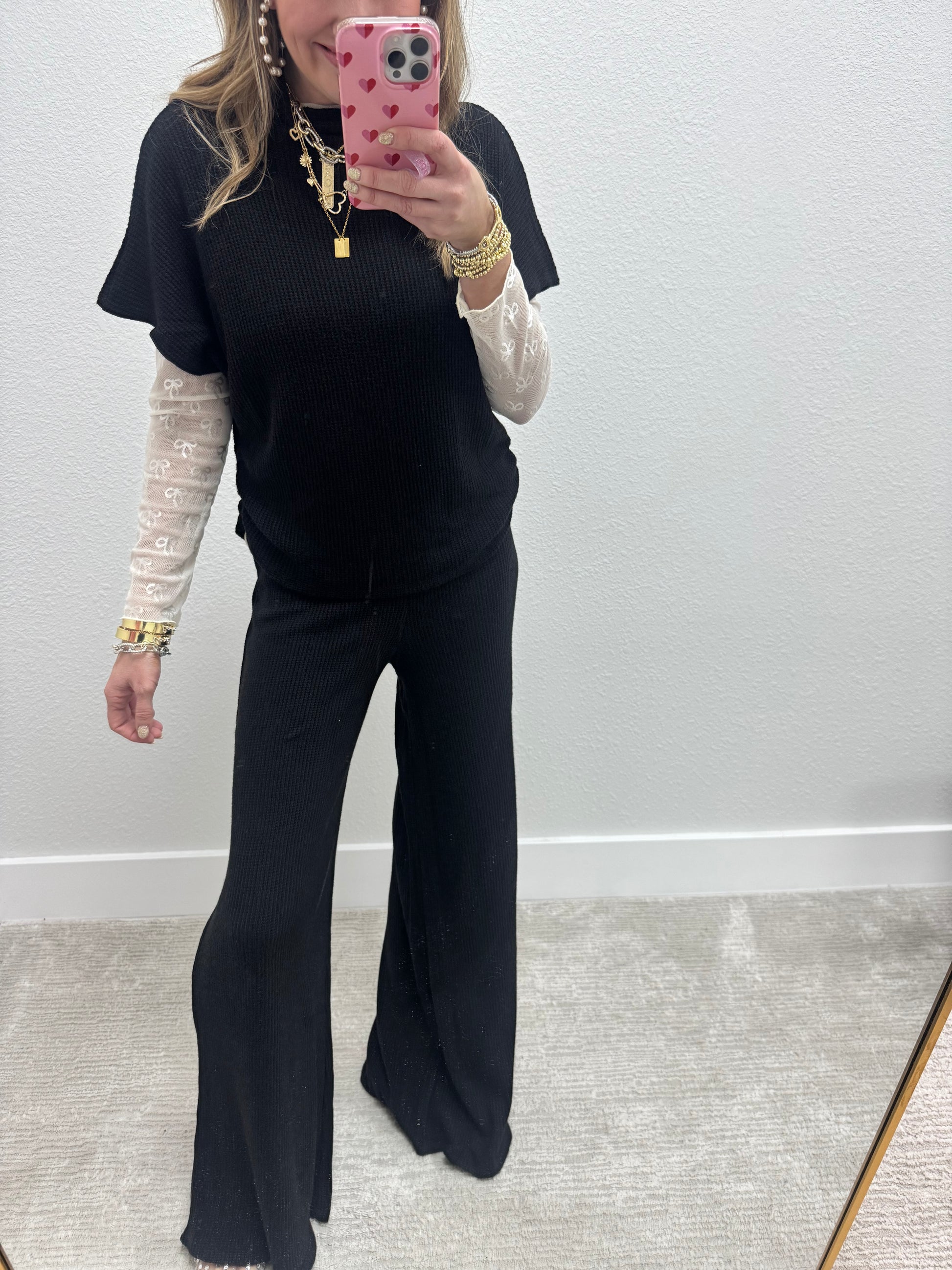 The most amazing material ever, a set you will NOT want to take off. It’s so cute and can be worn for dressy, or lounge, your preference. It’s a TTS fit and the pants have an elastic waist. Macy is a 2/4 and 5’7 wearing the small