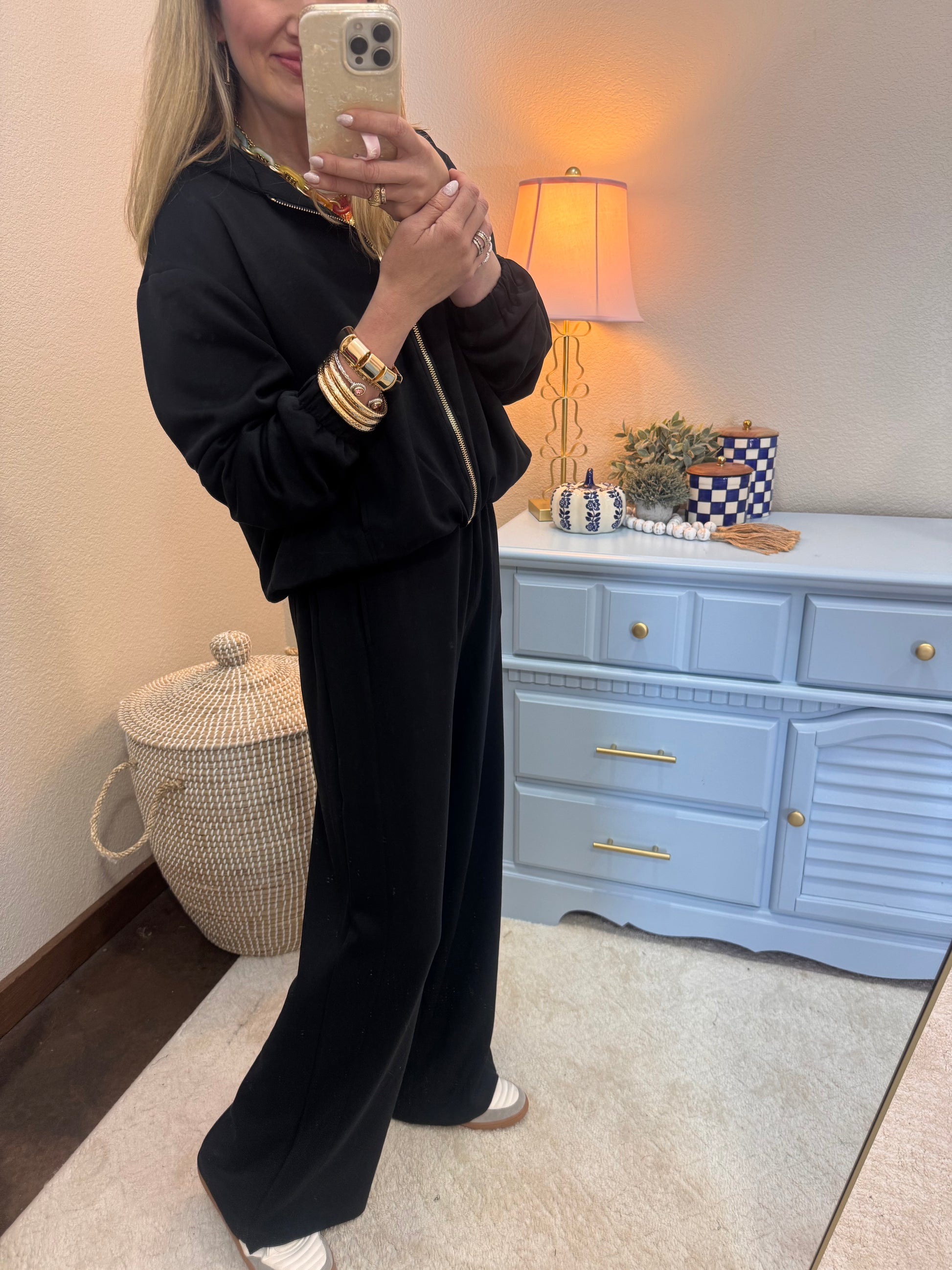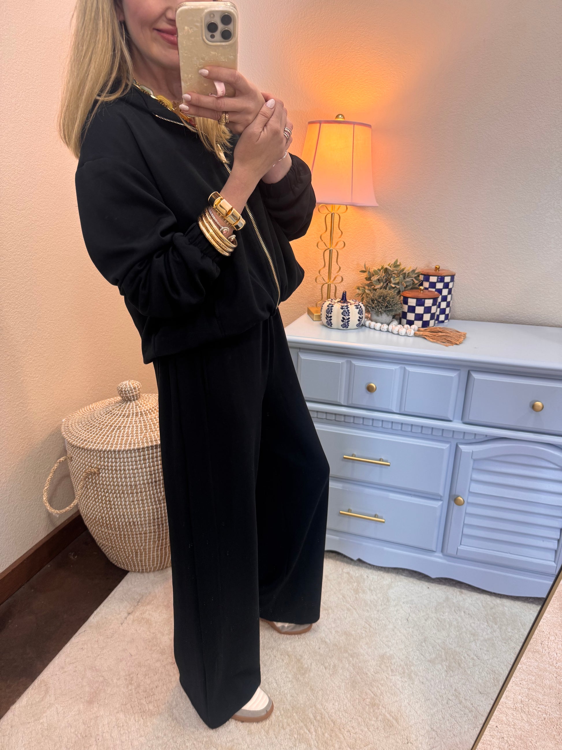 Look at this amazing scuba two piece set! One of the nicest sets we have ever had, the material is simply amazing!!! The gold zip and drawstring accents make it look so elevated. Pants are an elastic waist and the top has a cinch you can make tighter or looser. 47% Polyester 46% Rayon 7% Spandex. This is a relaxed fit, Macy is a 2/4 and 5'7" wearing a small.