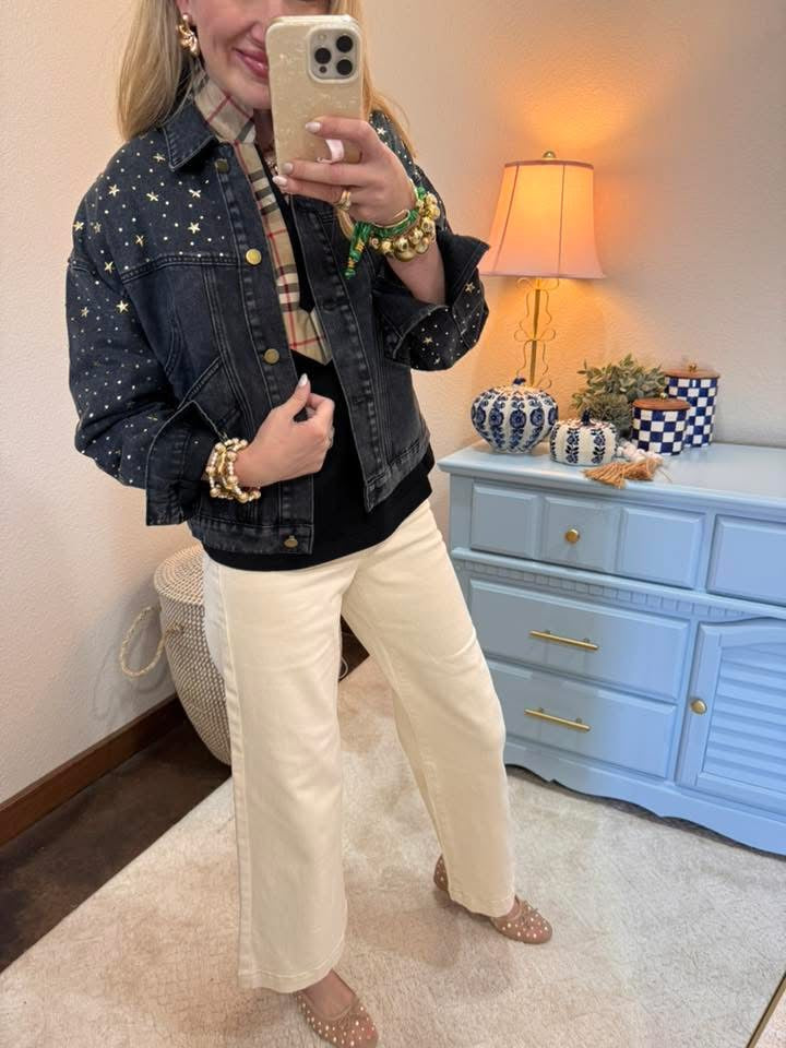 The cutest star studded denim jacket!! The back has gold buttons going diagonally, adorable!! This is a relaxed fit. Macy is a 2/4 and is 5"7. She is wearing a small.