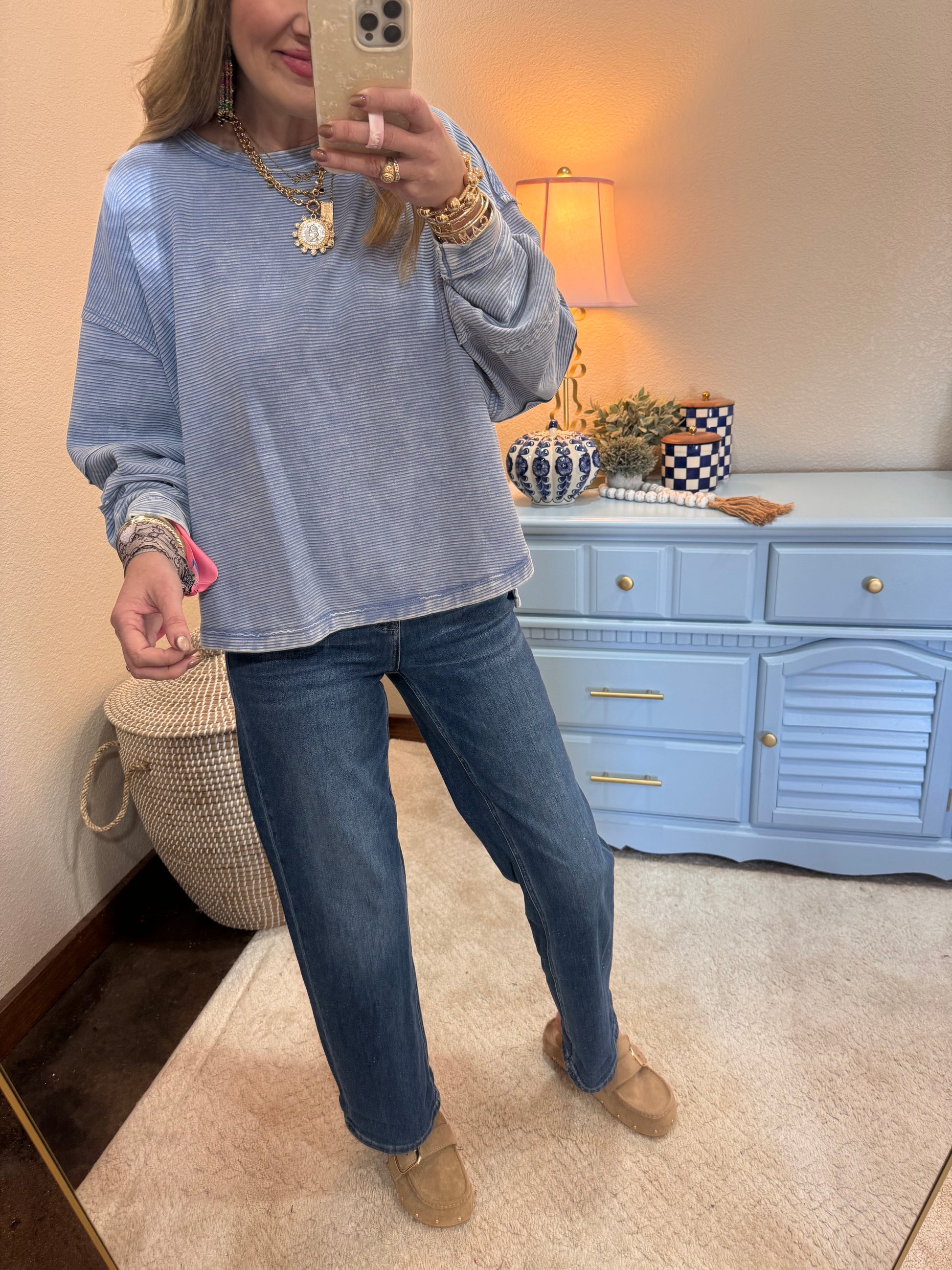 Blue Acid Washed Double Ribbed Exposed-Seam Pullover