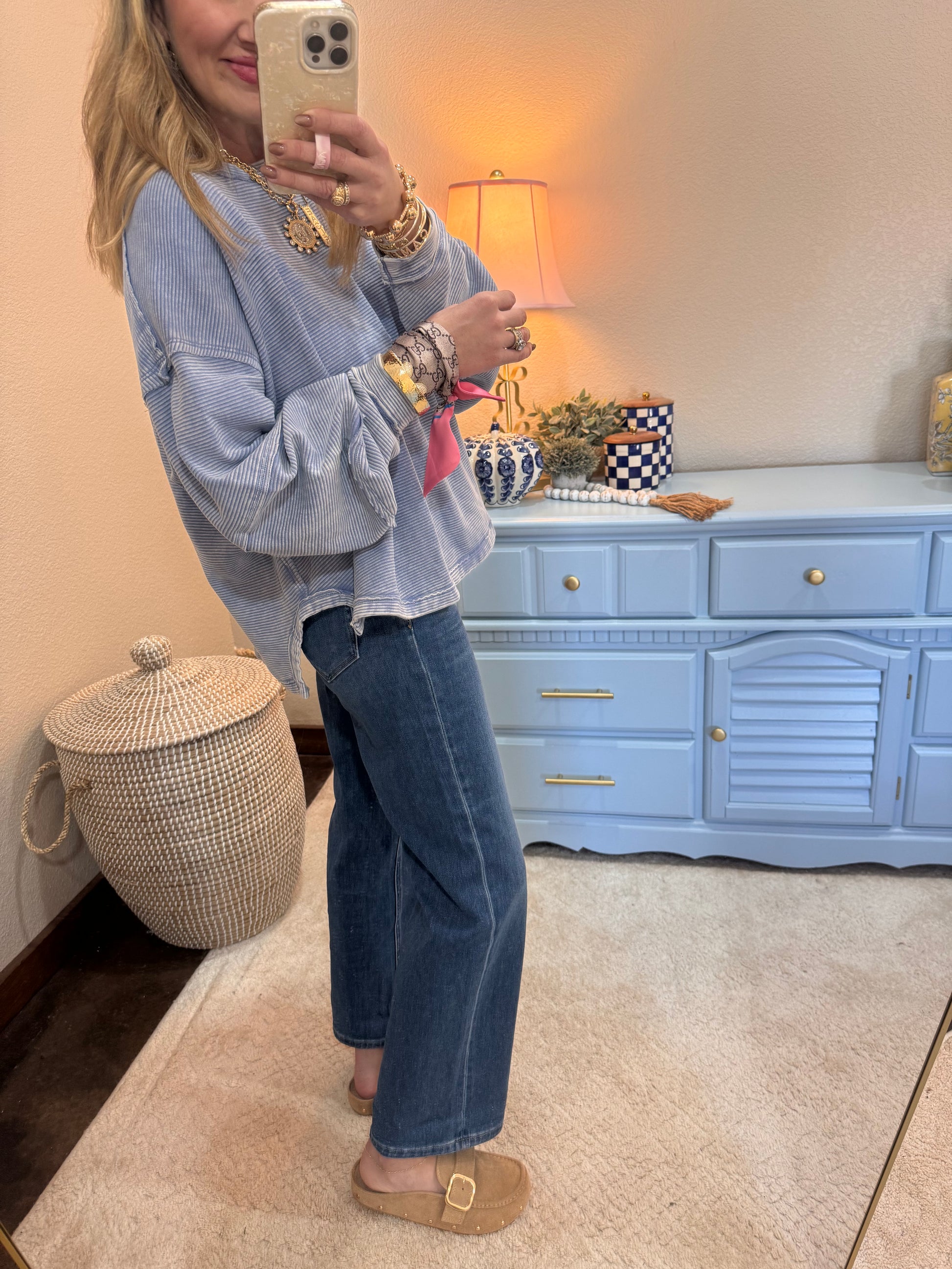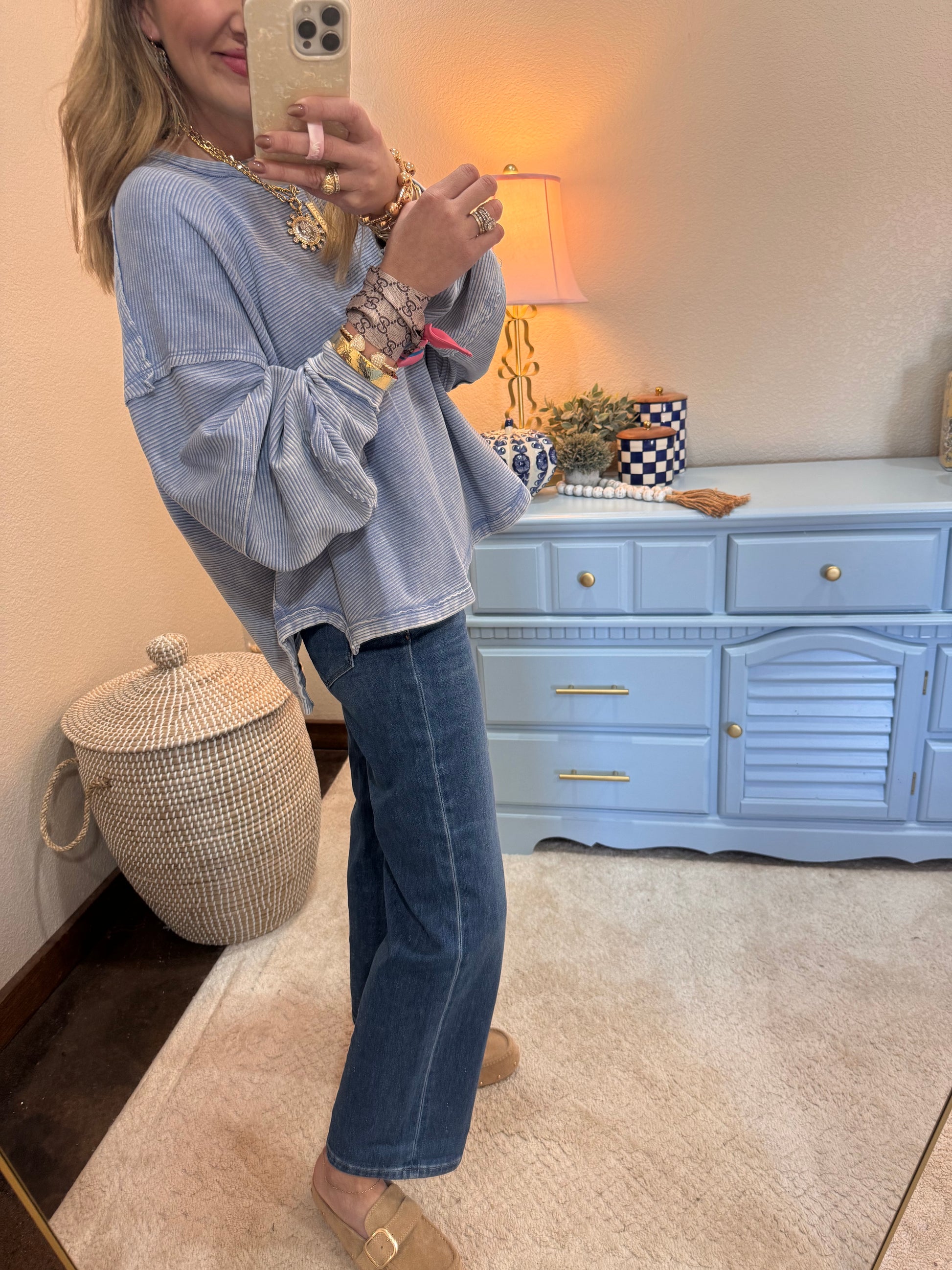 A new style that we just LOVE!!! Look how cute all the details are, the amazing ribbed material, Mineral Washed color, cute side detail with the hem, an oversized fit, and just THE BEST!!! these are 100% Cotton and a roomy fit, Macy is a 2/4 and 5'7 wearing the S/M
