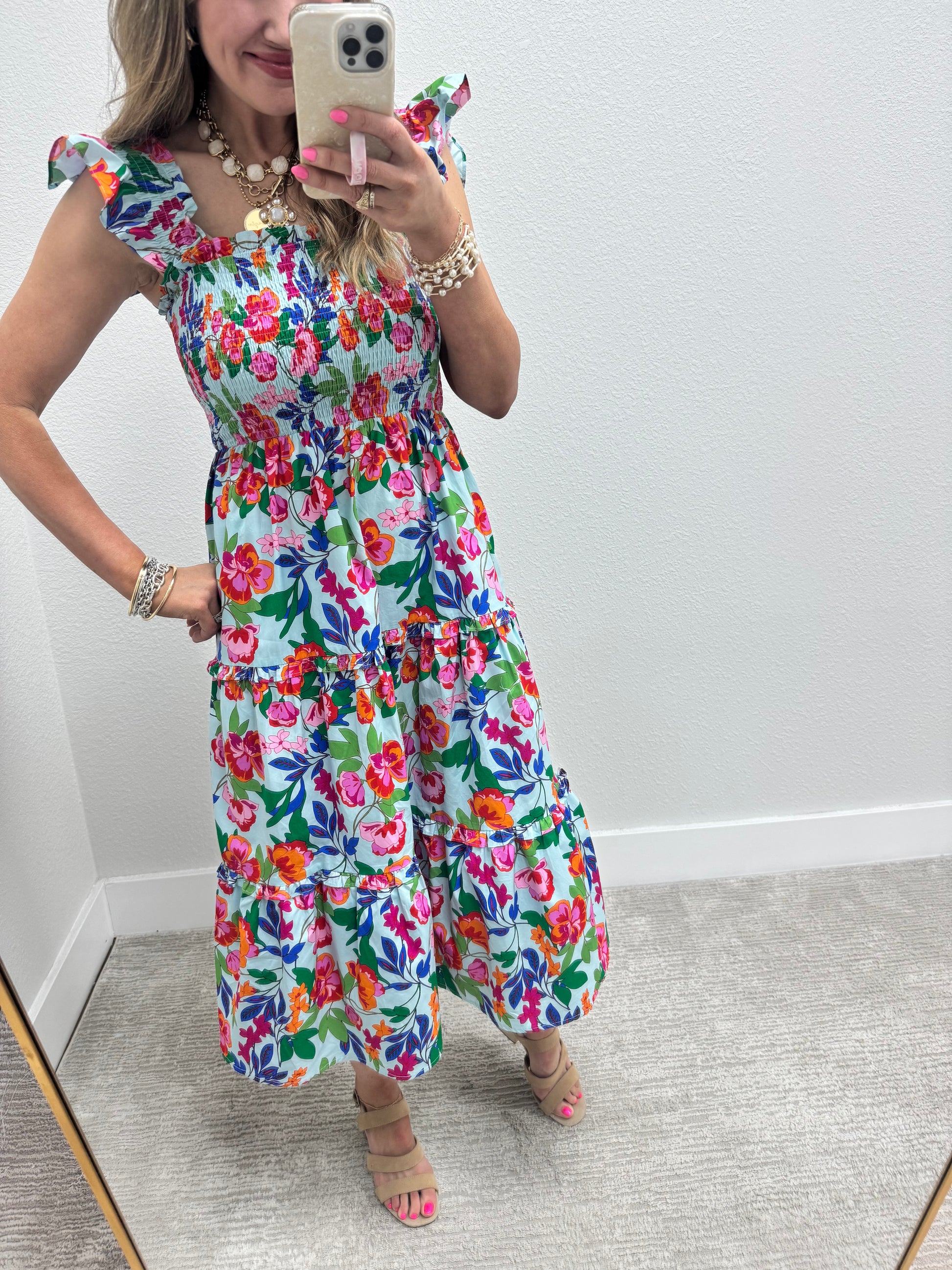 The most beautiful dress and so flattering! A smocked stretchy top and a tts fit. Macy is a 2/4 and 5’7 wearing the XS
