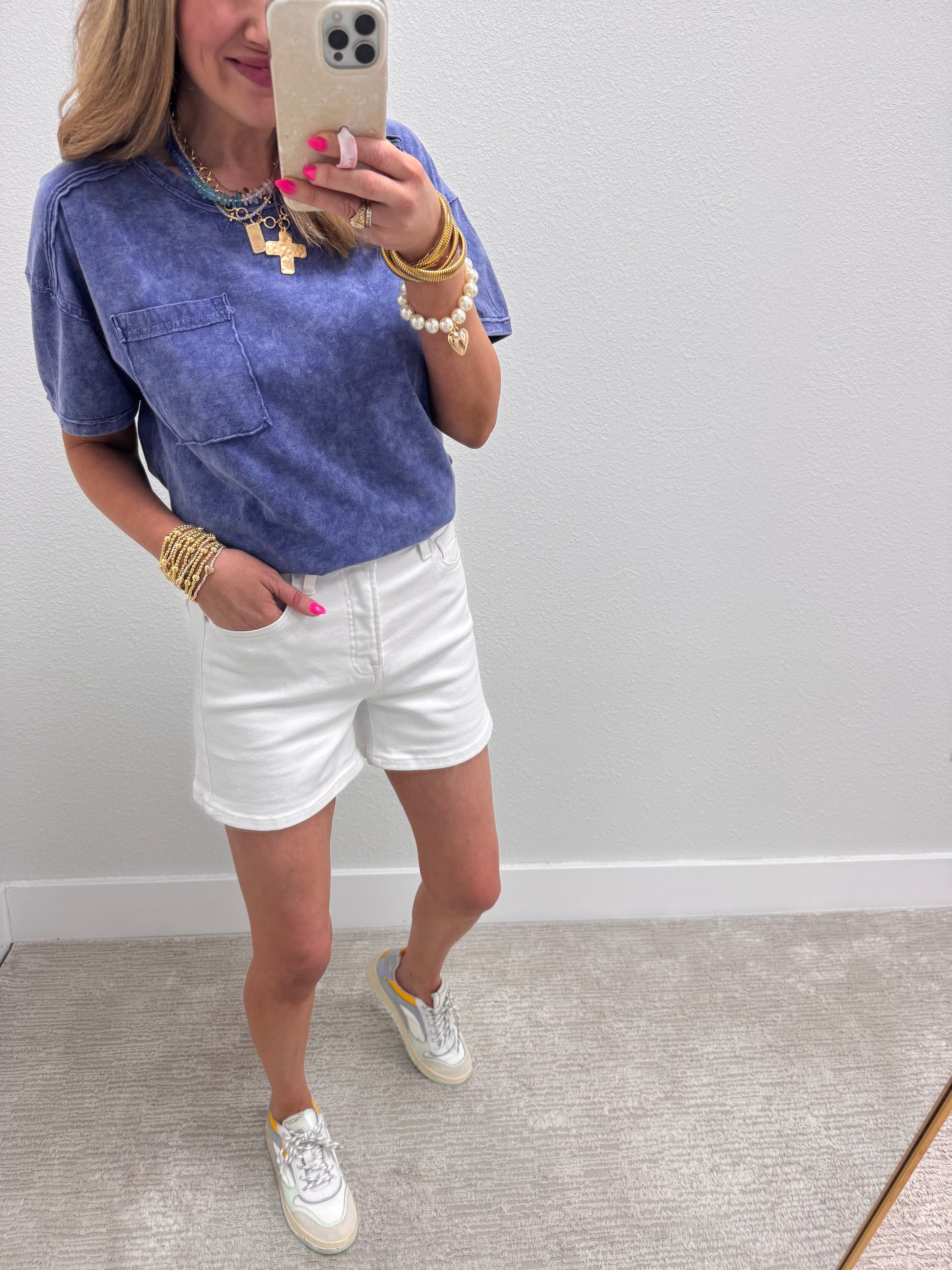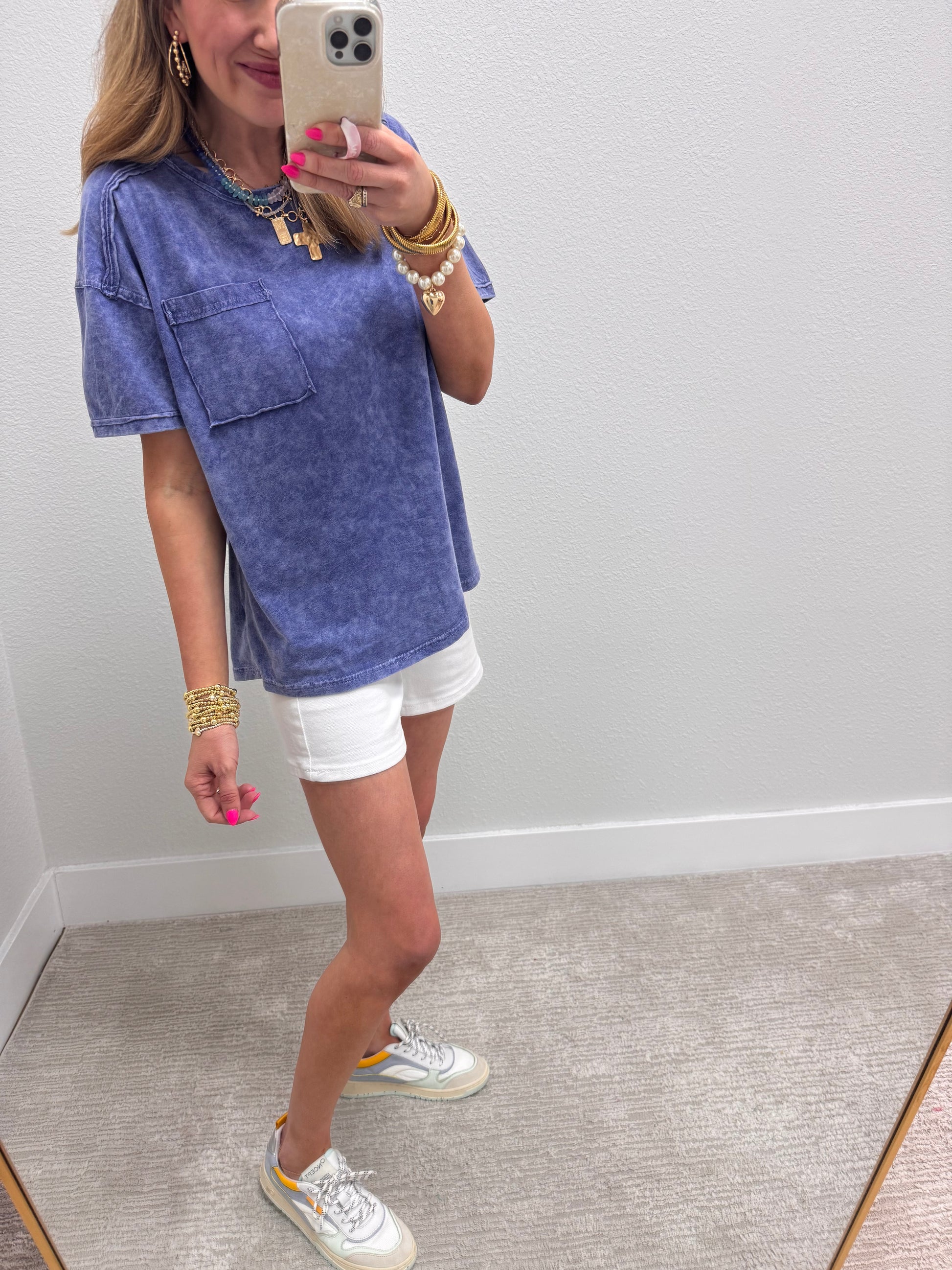 We LOVE this little top, so perfect and easy for spring and summer. It is a mineral washed color and has cute raw edges and is a relaxed fit, Macy is a 2/4 and 5'7 wearing the small