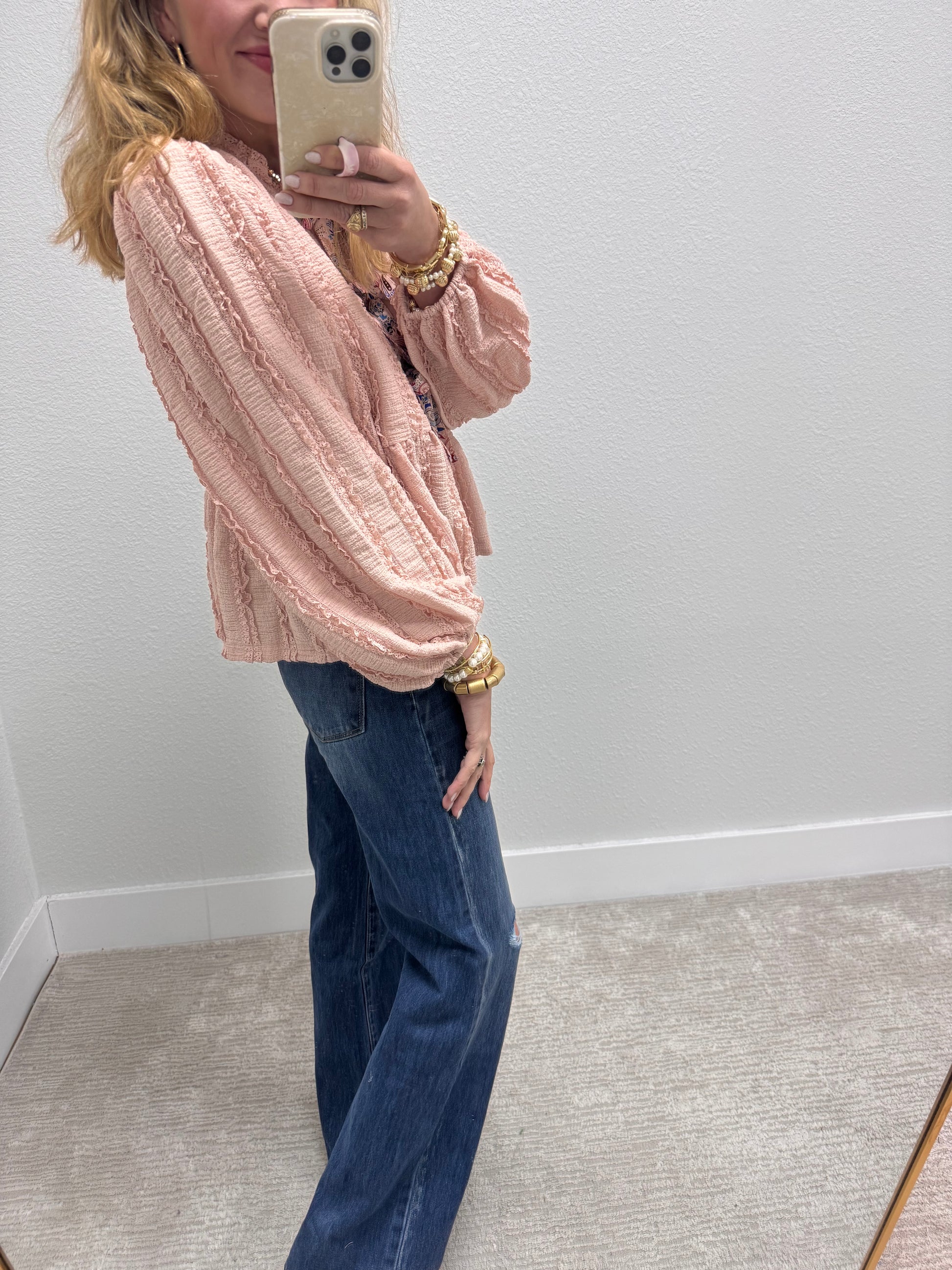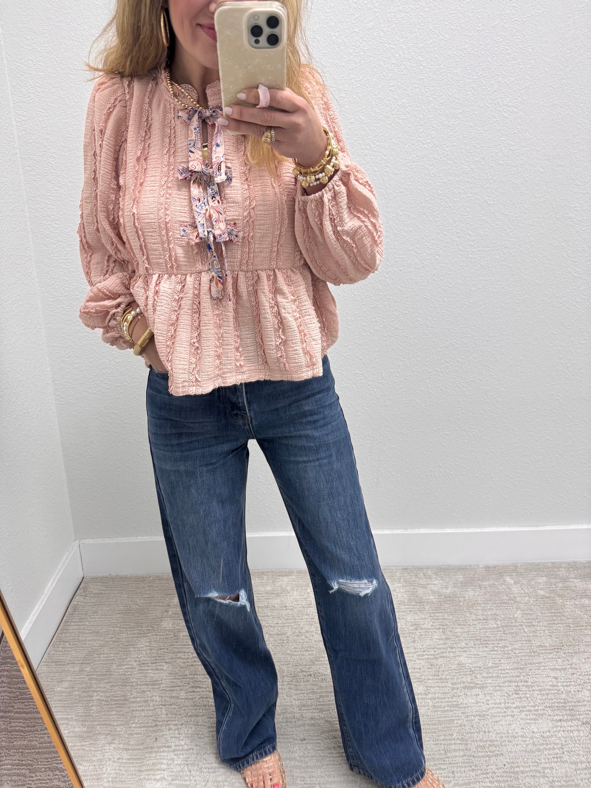 We think this top is soooo cute. It has the cutest little texture, cute babydoll fit, and cute ties in the front. Relaxed fit, Macy is 2/4 and 5’7 wearing the small