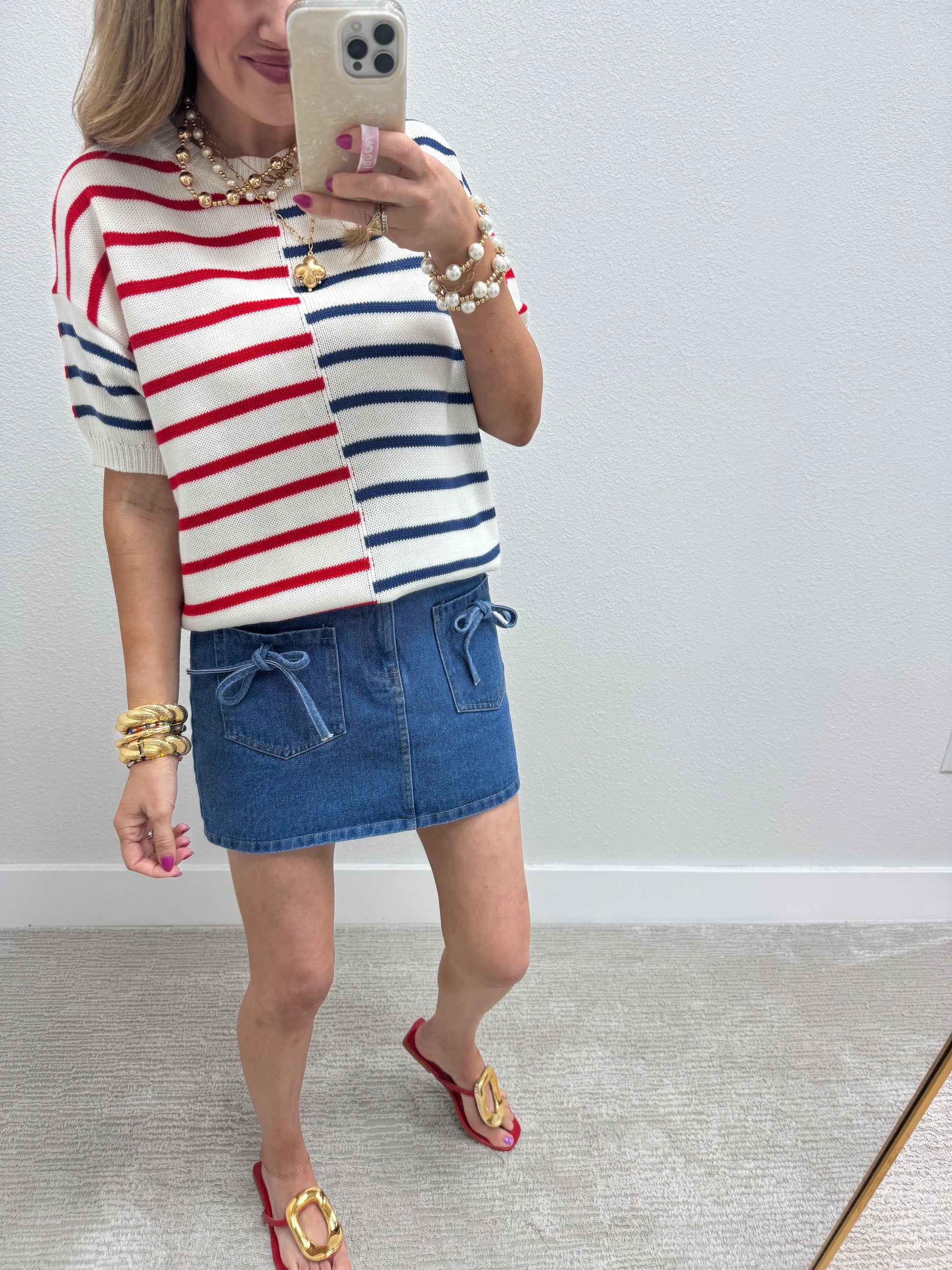 Denim skirt with the bows, how cute is this?! It’s a fitted fit, Macy is a 24/25 in pants and 5’7 and did the small for a little extra room