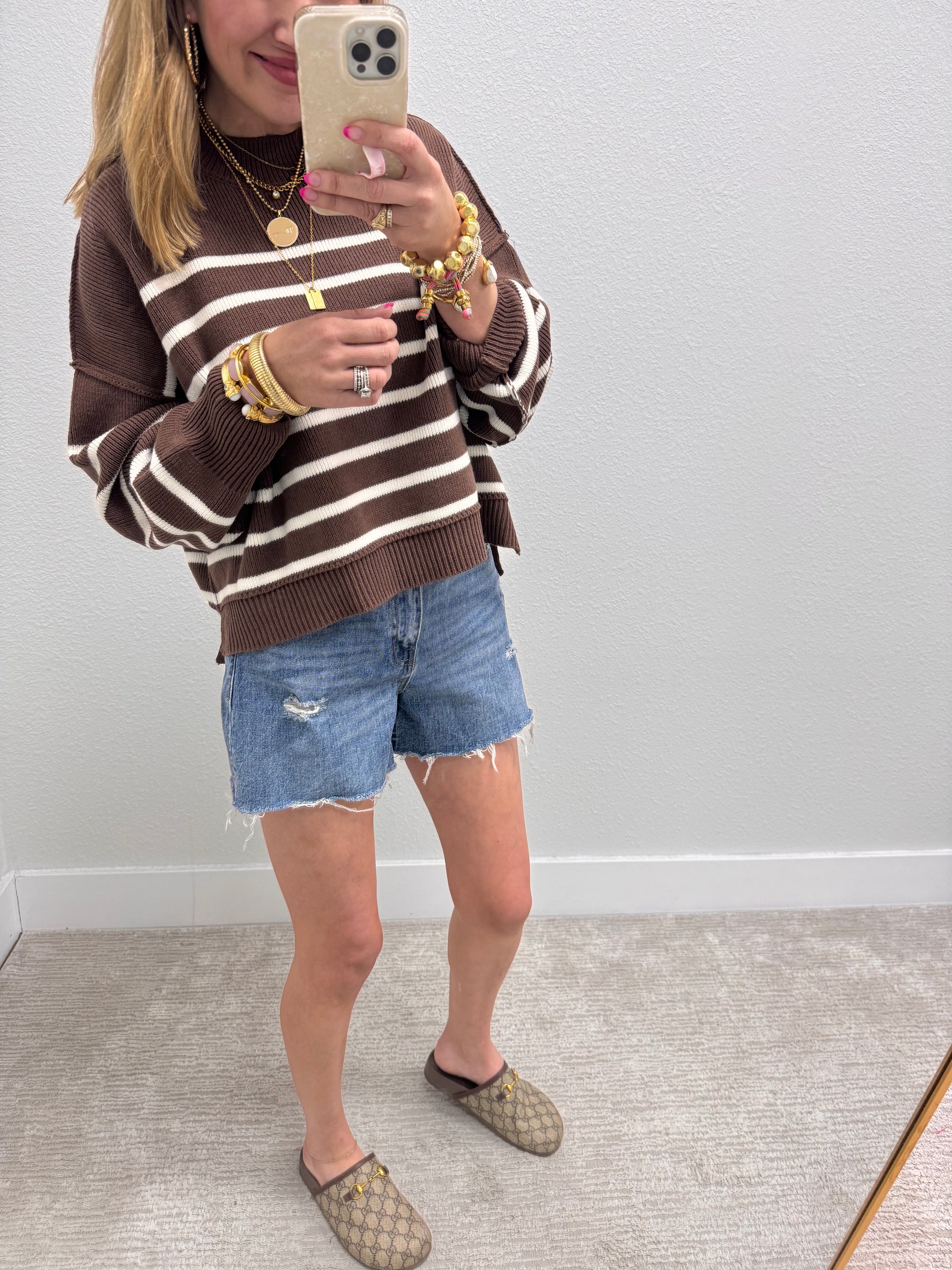 The sister to our #1 selling sweater and the first time ever, a striped version of the mock neck!!! The nicest material ever and the cutest fit, shorts or pants, perfect for both. We sure love these and are excited for them. Relaxed/roomy fit, Macy is a 2/4 and 5’7 wearing the small