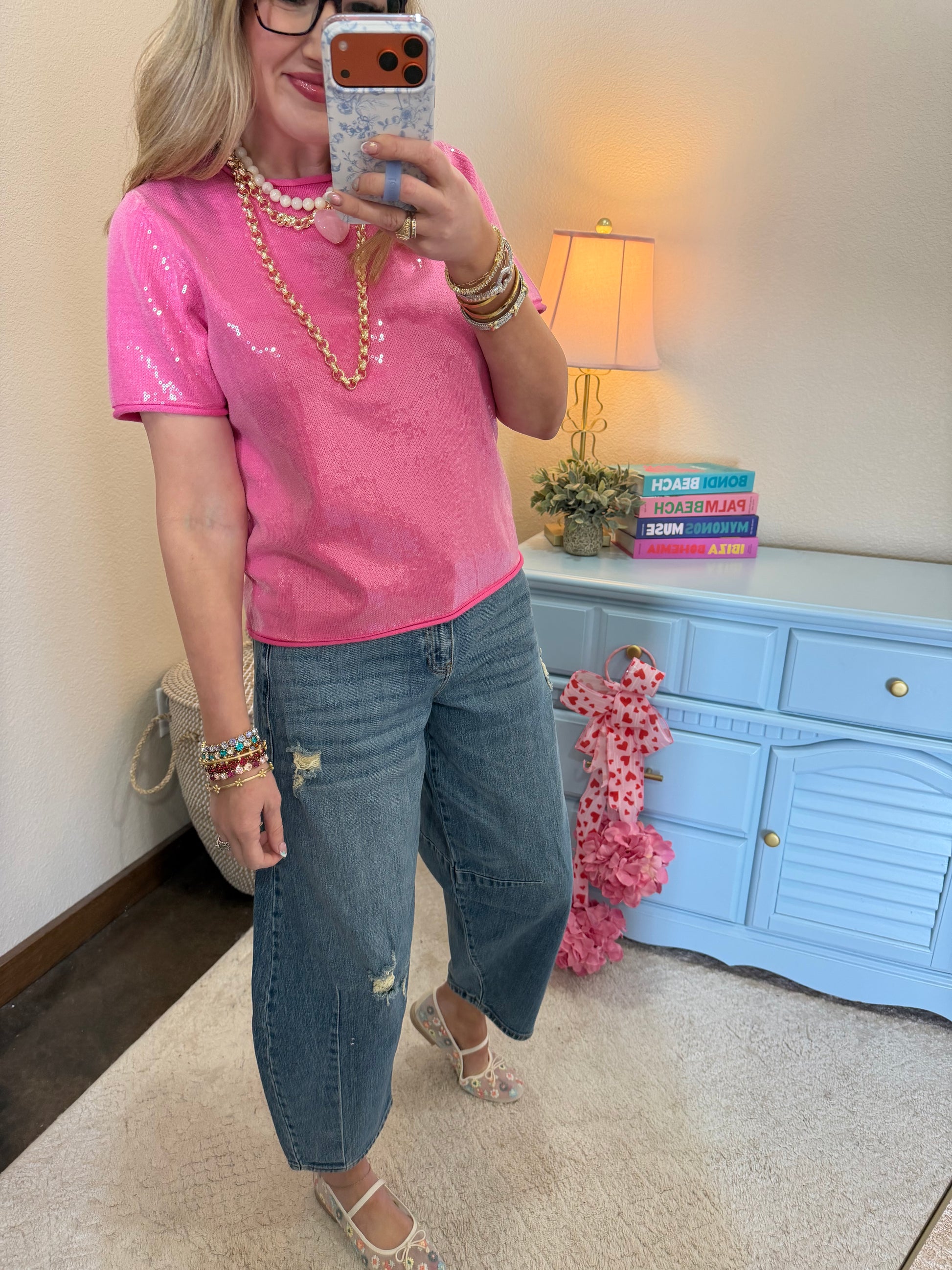 This top is so darn cute!!! It is covered in tiny clear sequins and is the nicest sweater style top, amazing! A TTS fit, Macy is a 2/4 and 5’7 wearing the small.