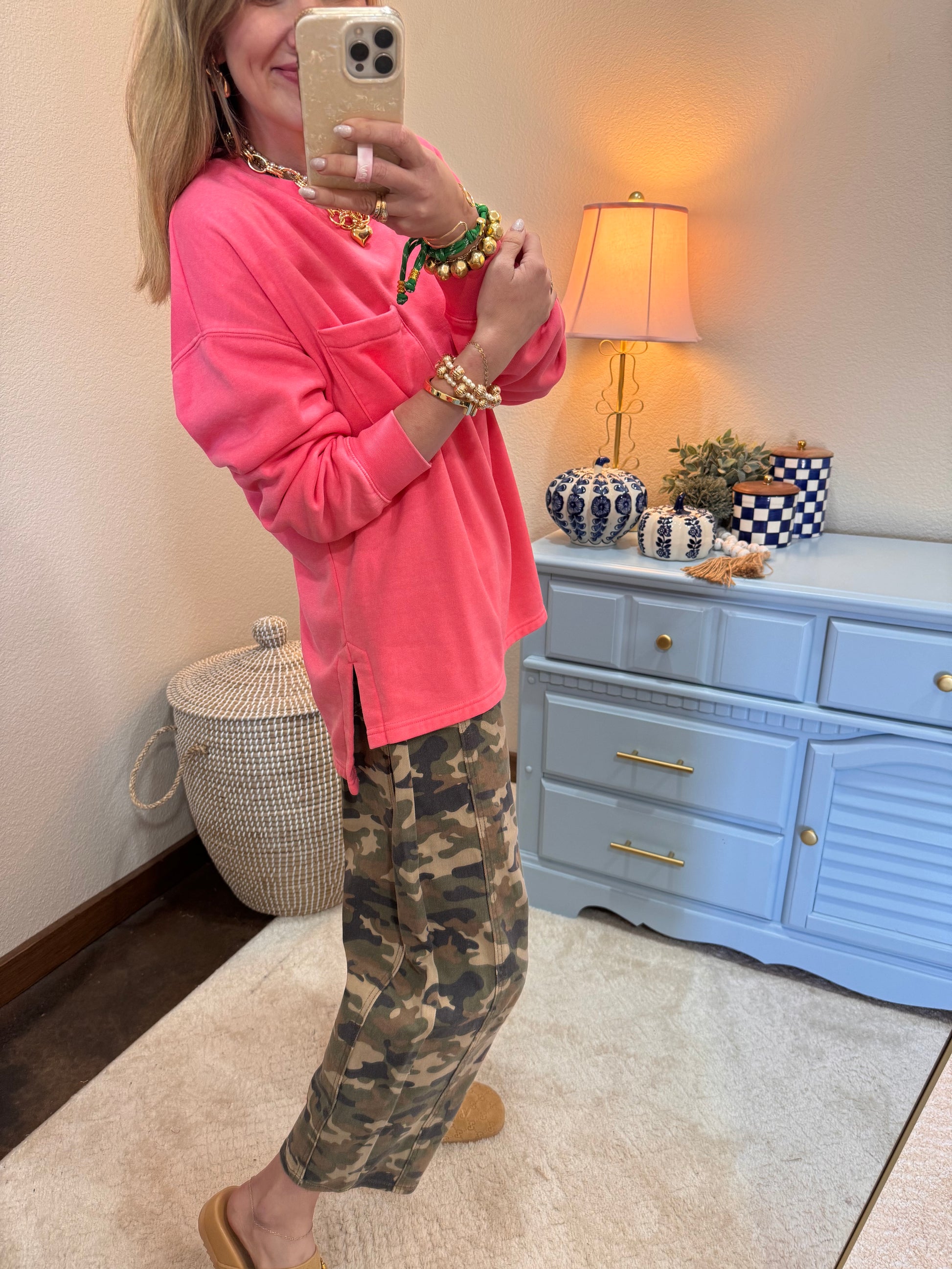 The cutest Camo jeans ever!! A cute, loose, barrel fit! They do run a bit big so we suggest you size down 1-2 sizes. Macy is 5’7 and a 24/25 in pants wearing the 1 here with quite a bit of room.