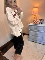 The cutest over-sized "Merry" shirt. The most amazing waffle material, thick and so cute! Cute split hem fit. Macy is a 2/4 and 5'7" wearing a small.