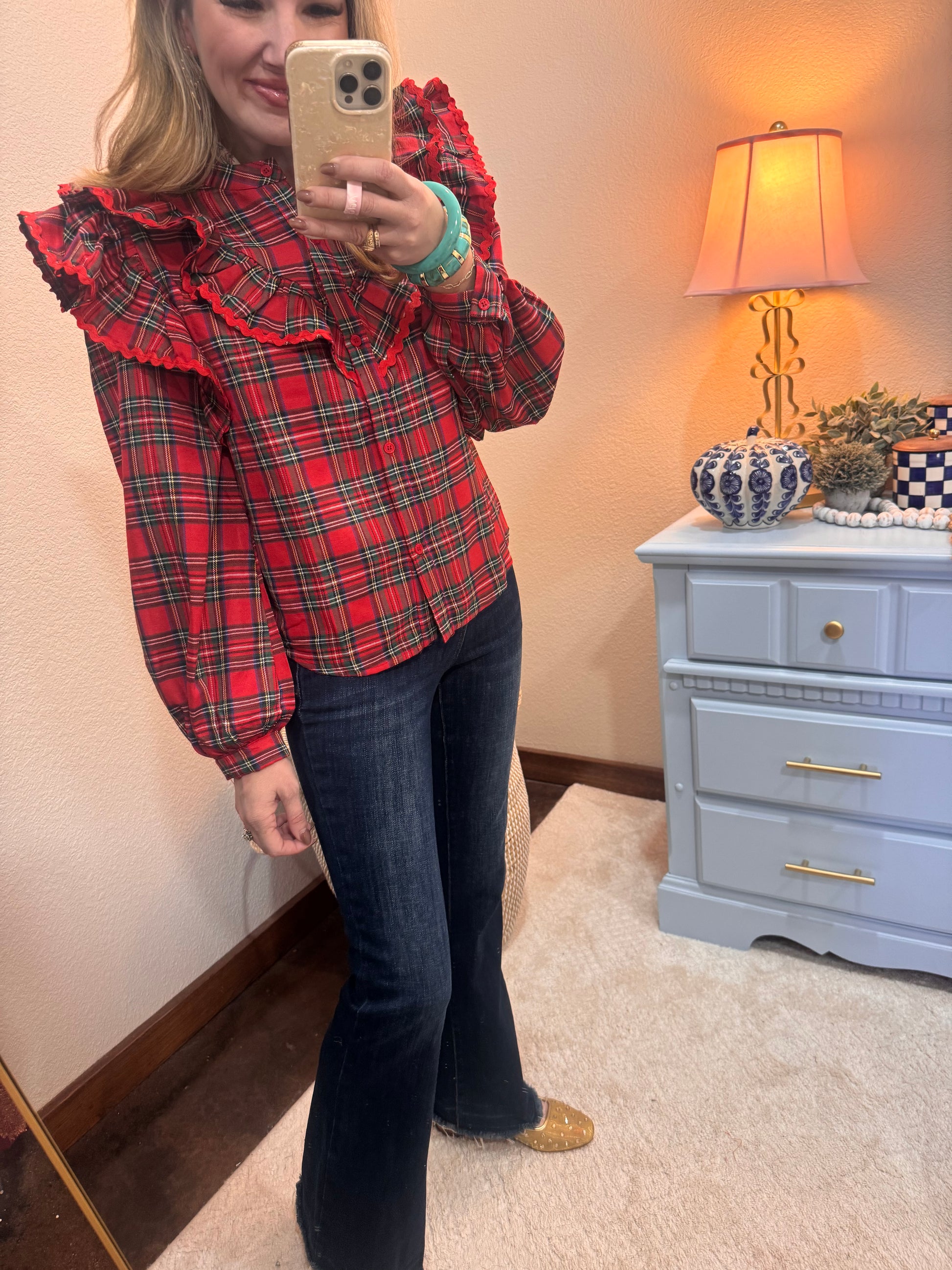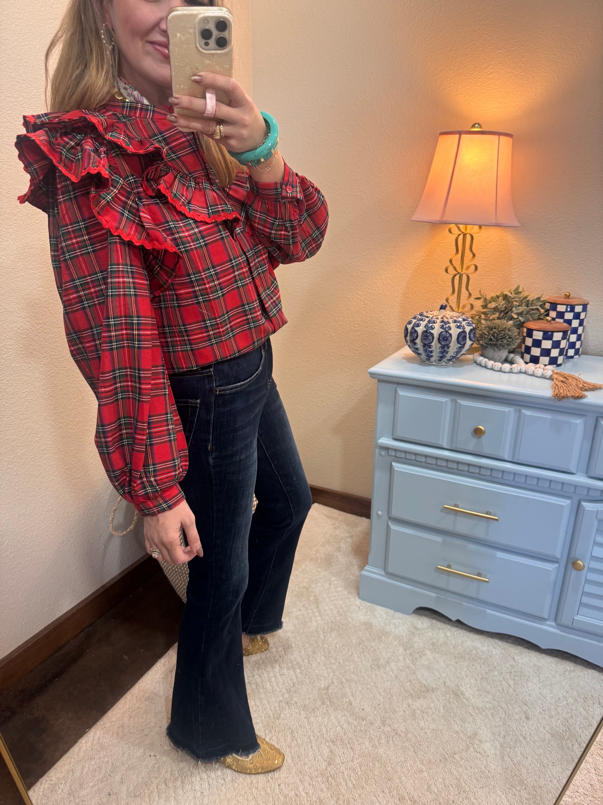 Christmas Plaid Ruffled Blouse Top With Ric Rac Trim