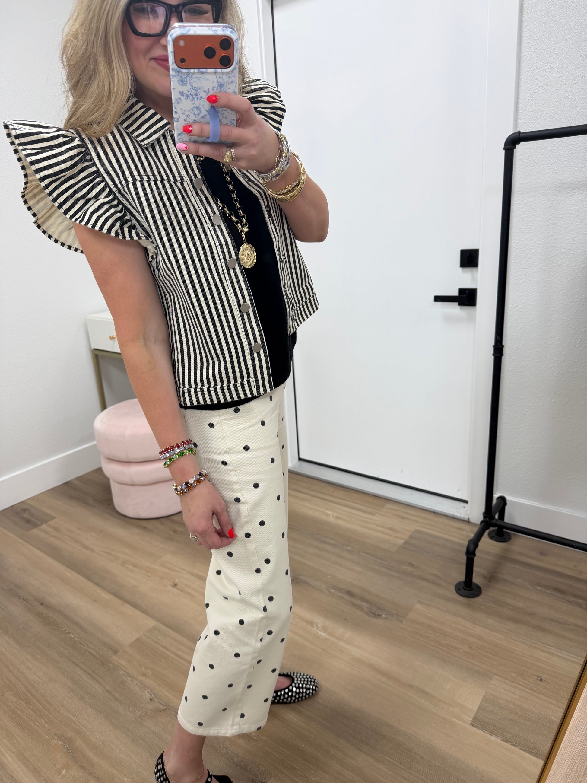Are these pants not so fun?! We sure love them! There is no stretch and they are a TTS fit. Macy is a 25 in pants and 5’7 wearing the small. 100% cotton