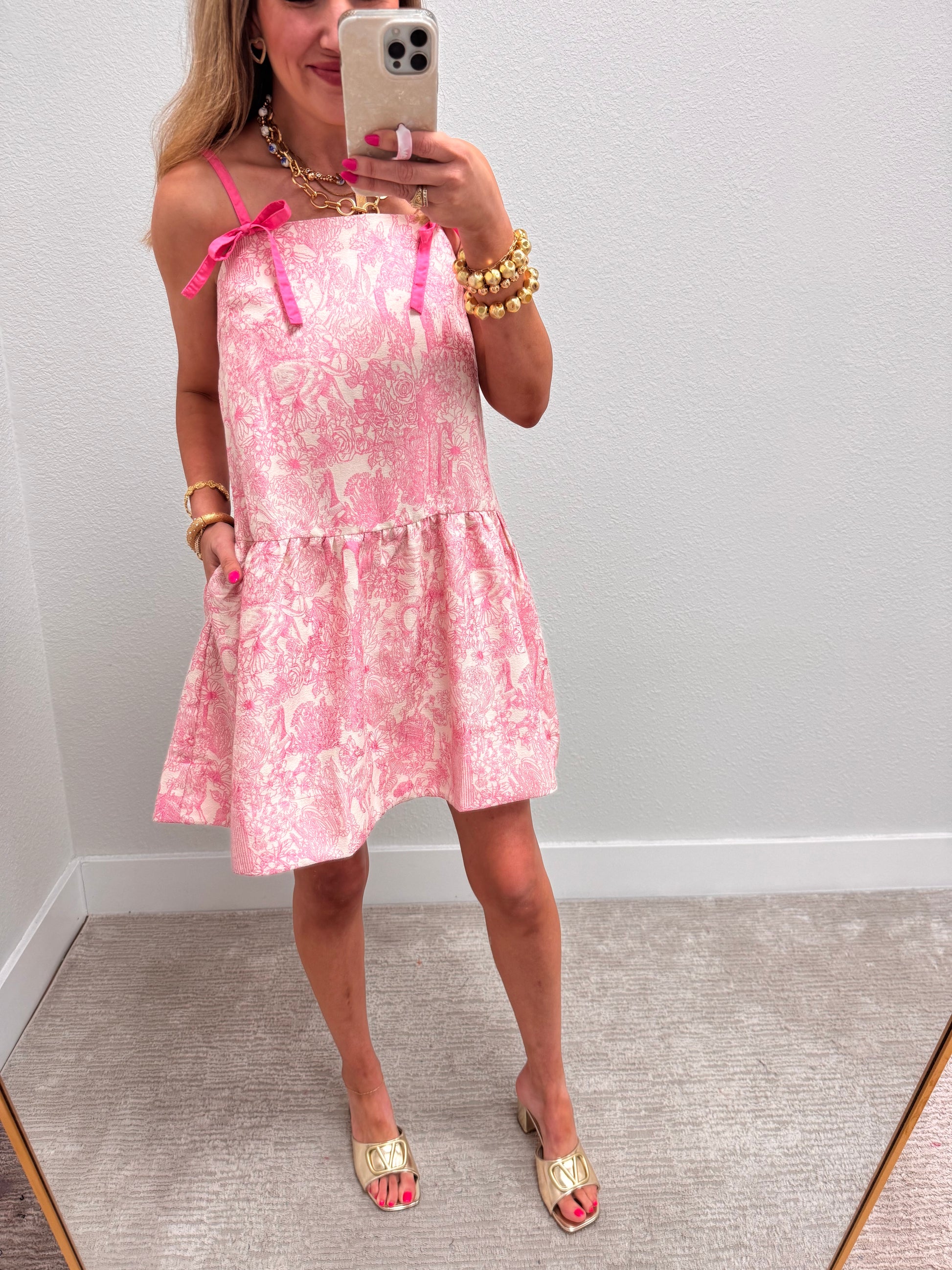We are in LOVE with everything about this dress. The ties, the pattern, the material, the drop waist, all of it. Soooo cute. There is no stretch to the fabric but it is a relaxed TTS fit, Macy is a 2/4 and 5’7 wearing the small