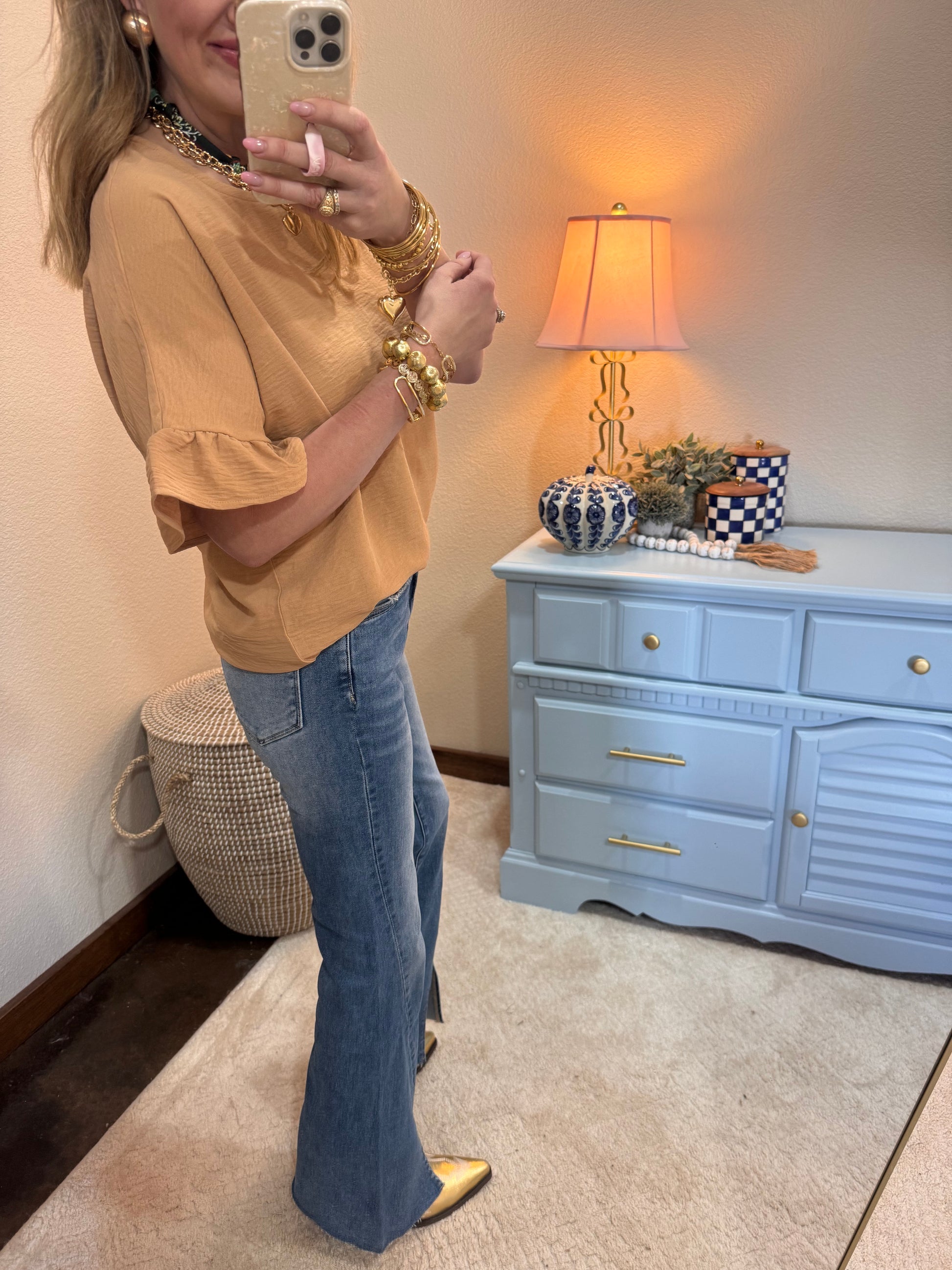 This cute little top is the best, lightweight material! It has the best little ruffle sleeves to add some fun. This would be so cute dressed up for the office, or dressed down with some cute shorts. Poly and a relaxed fit, Macy is a 2/4 and 5’7 wearing the small