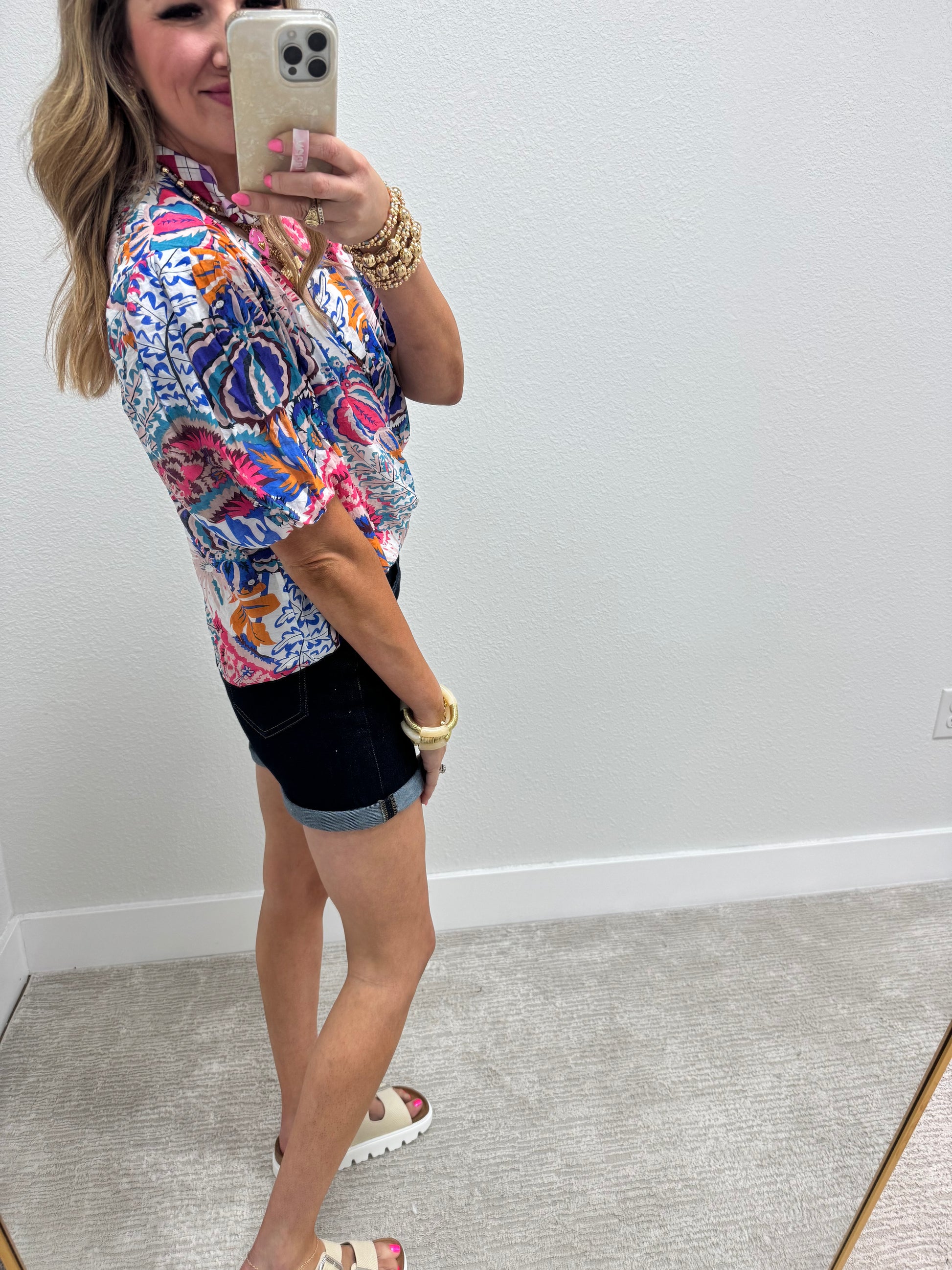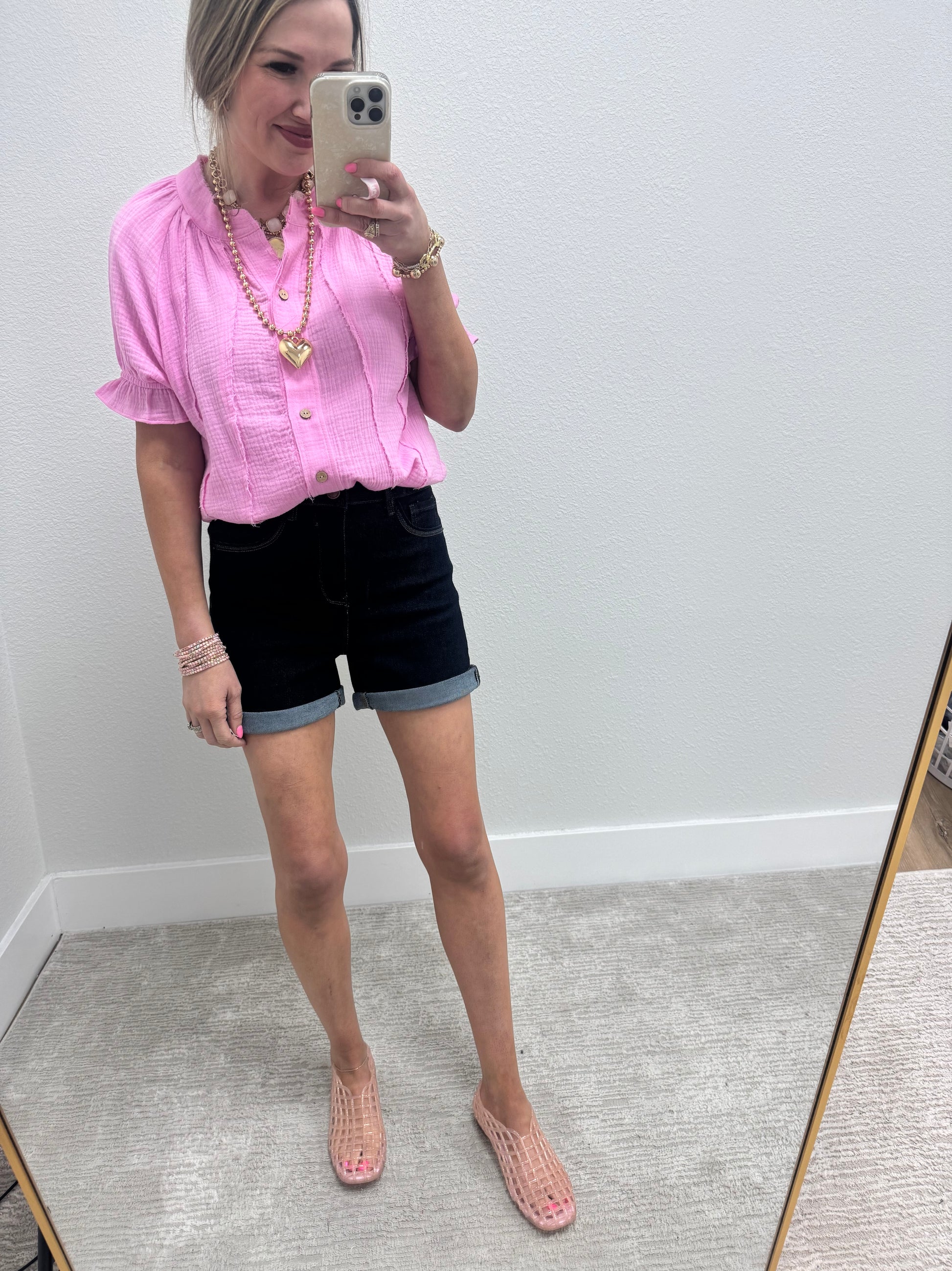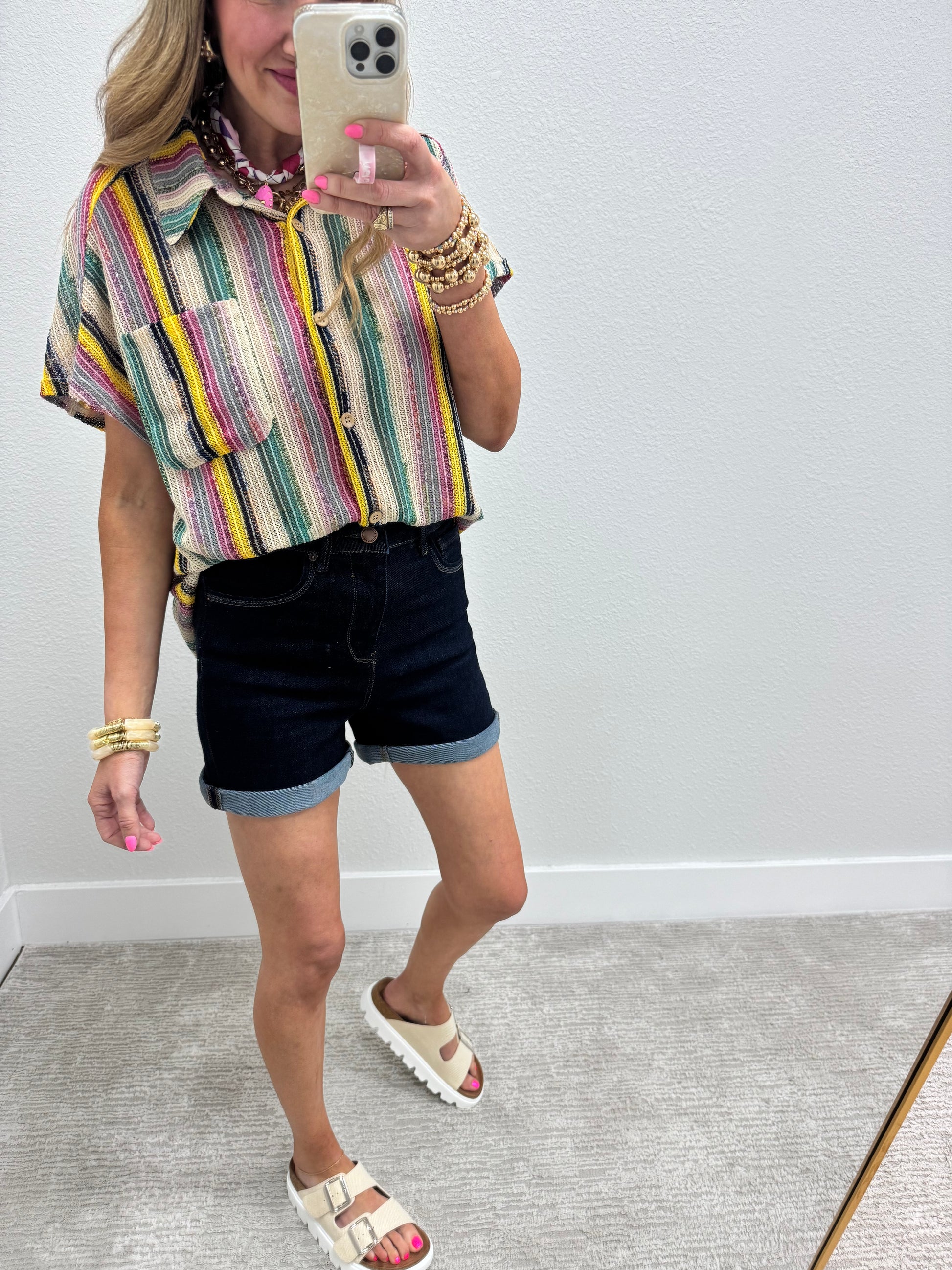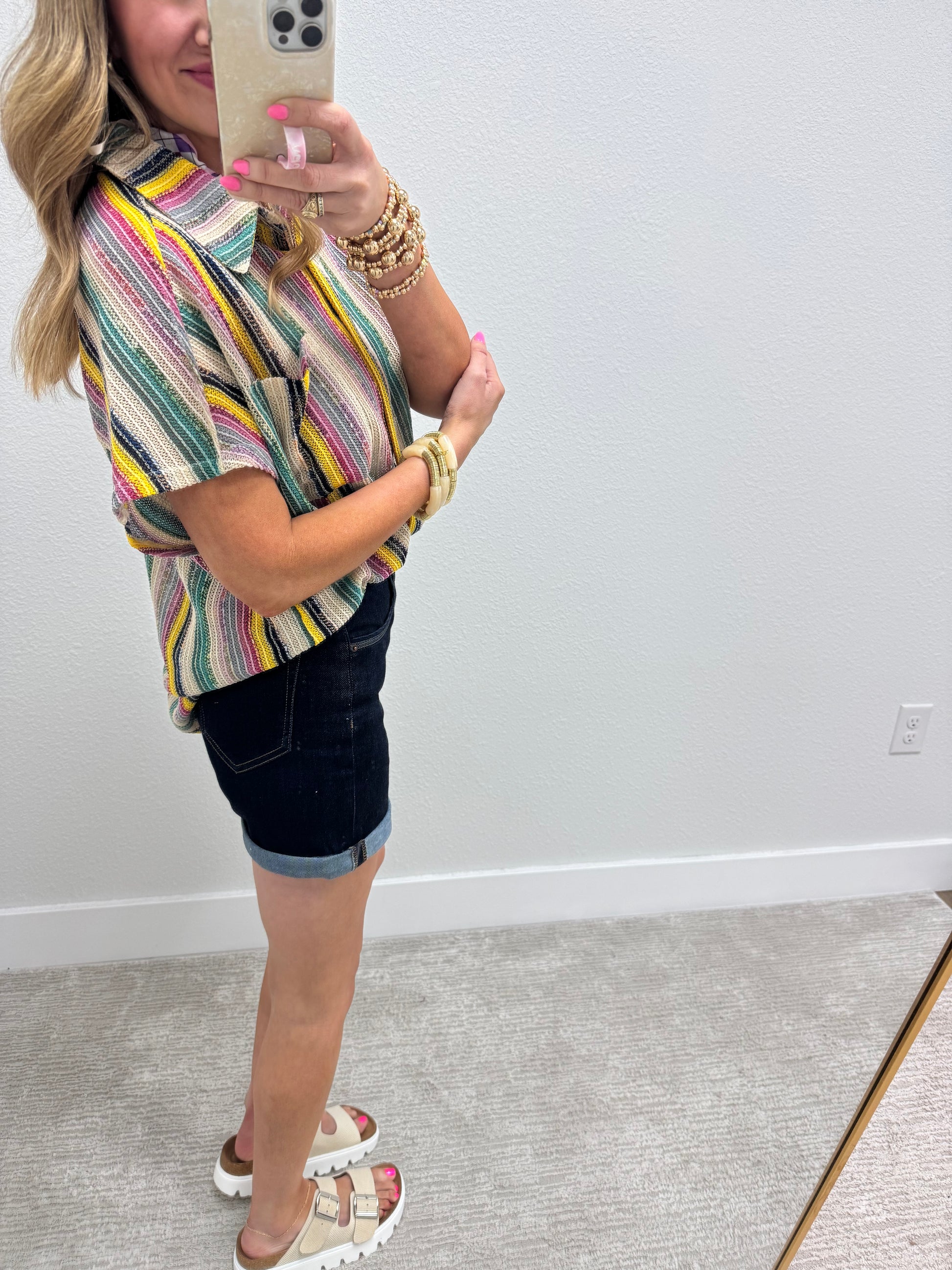 A new pair of Risen, stretchy and amazing!! They come cuffed, and you can uncuff once or twice. About a 4” inseam cuffed and about a 6” inseam if you uncuff all the way. They are a high rise and stretchy. We suggest size 26/27 small, 28/29 medium, 30/31/32 XL. Macy is a 2/4 and 5’7 wearing the small