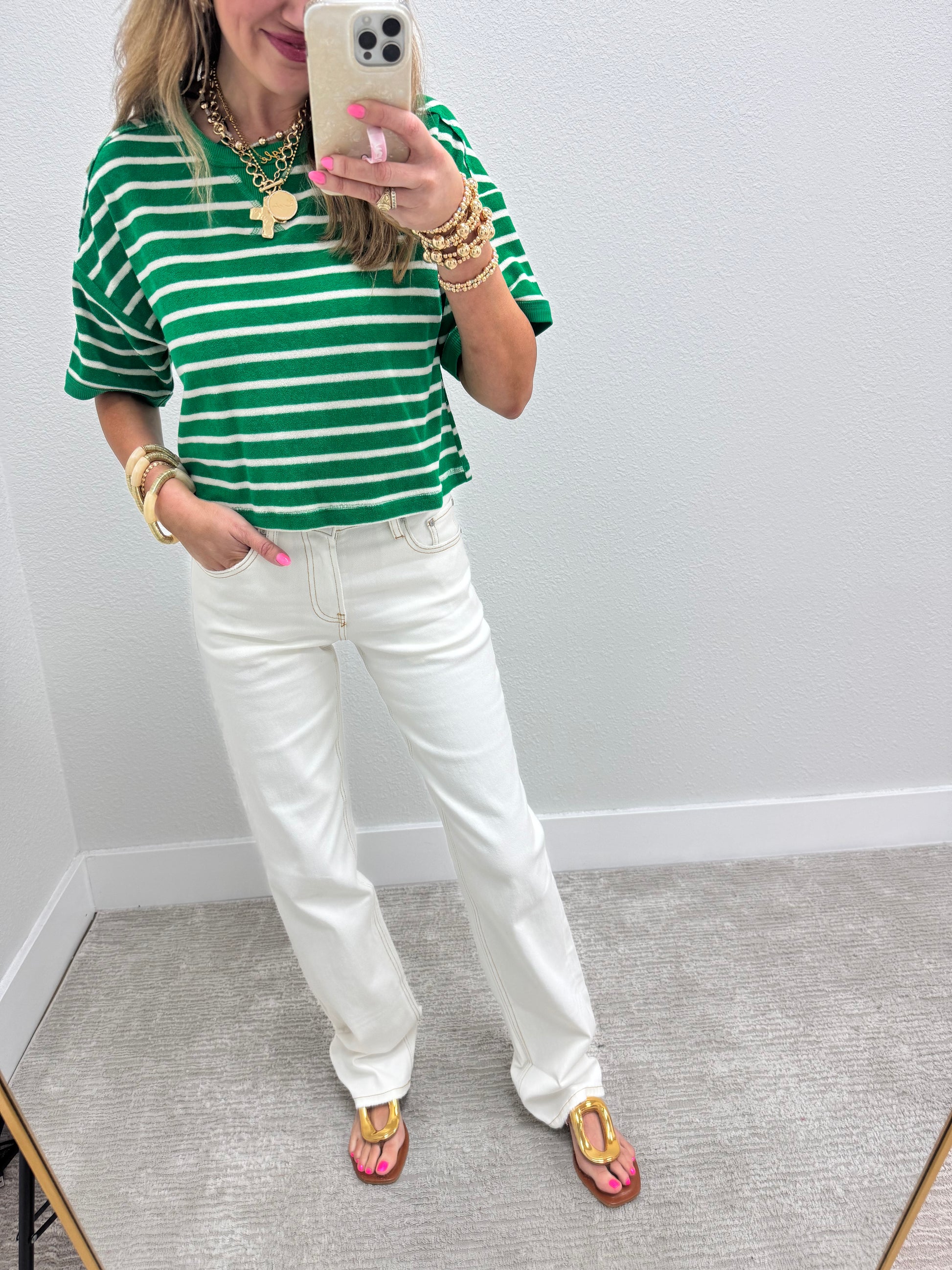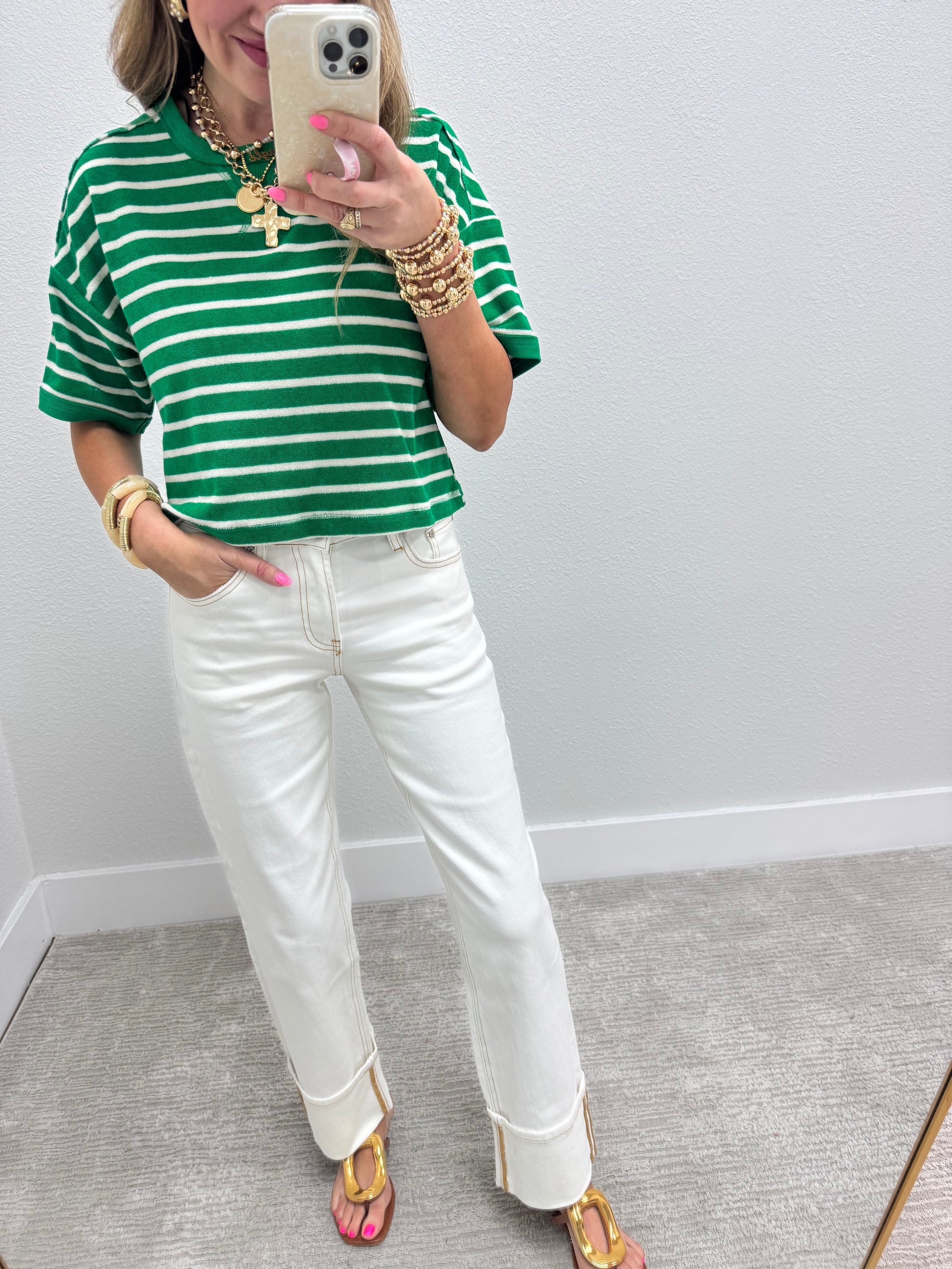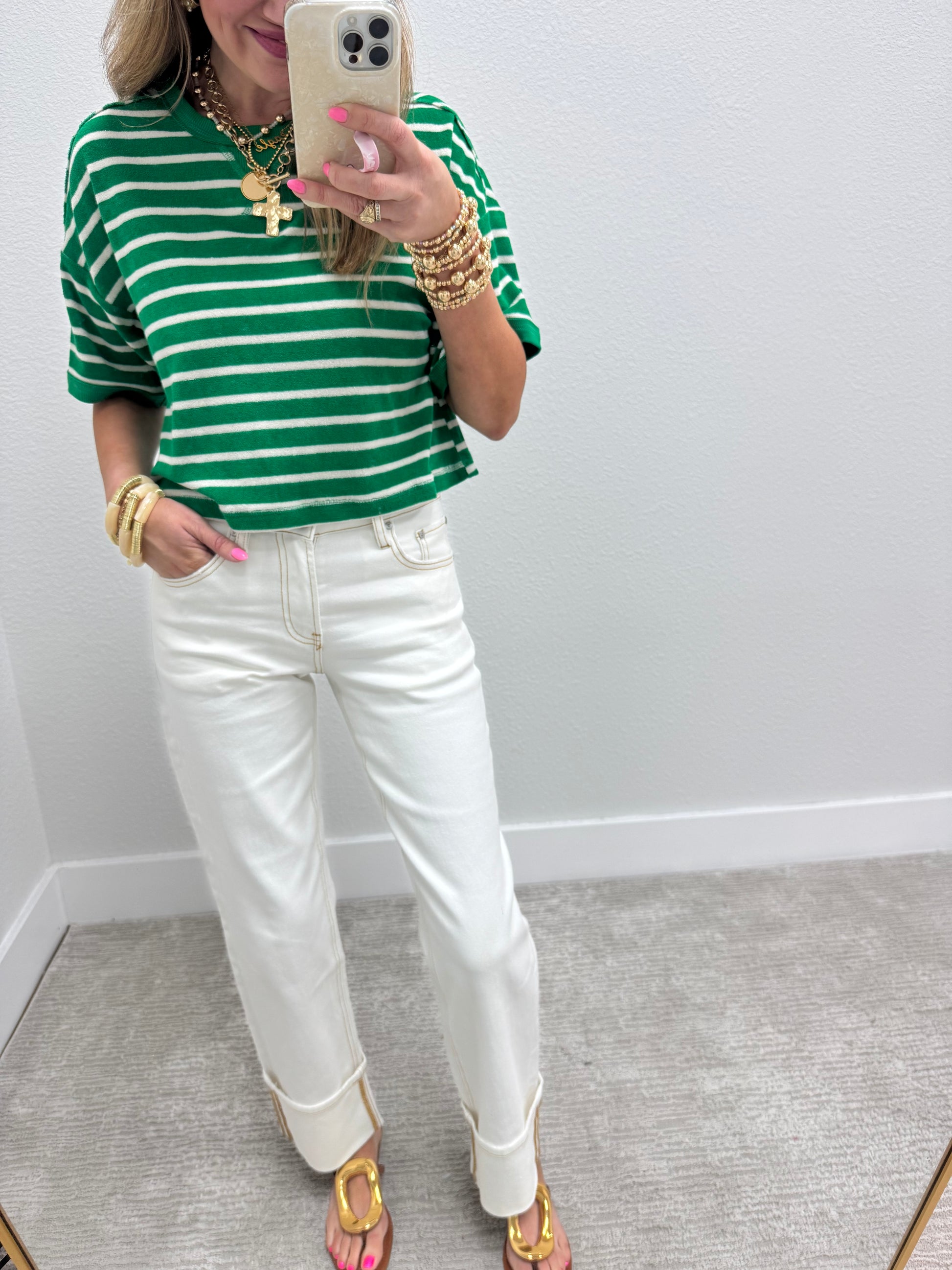 Cutest little top, a French terry and a cute shorter fit. It’s simple, but so fun for summer and is a cute swing fit! Macy is a 2/4 and 5’7 wearing the small