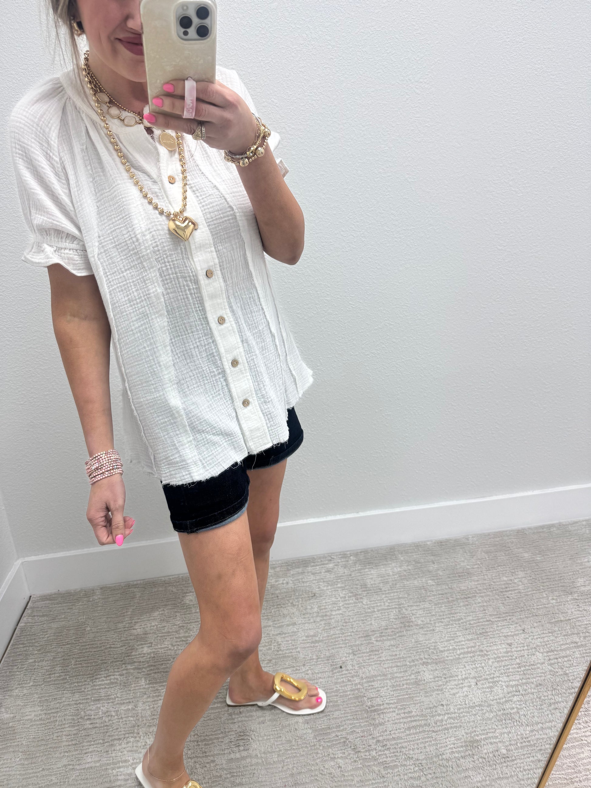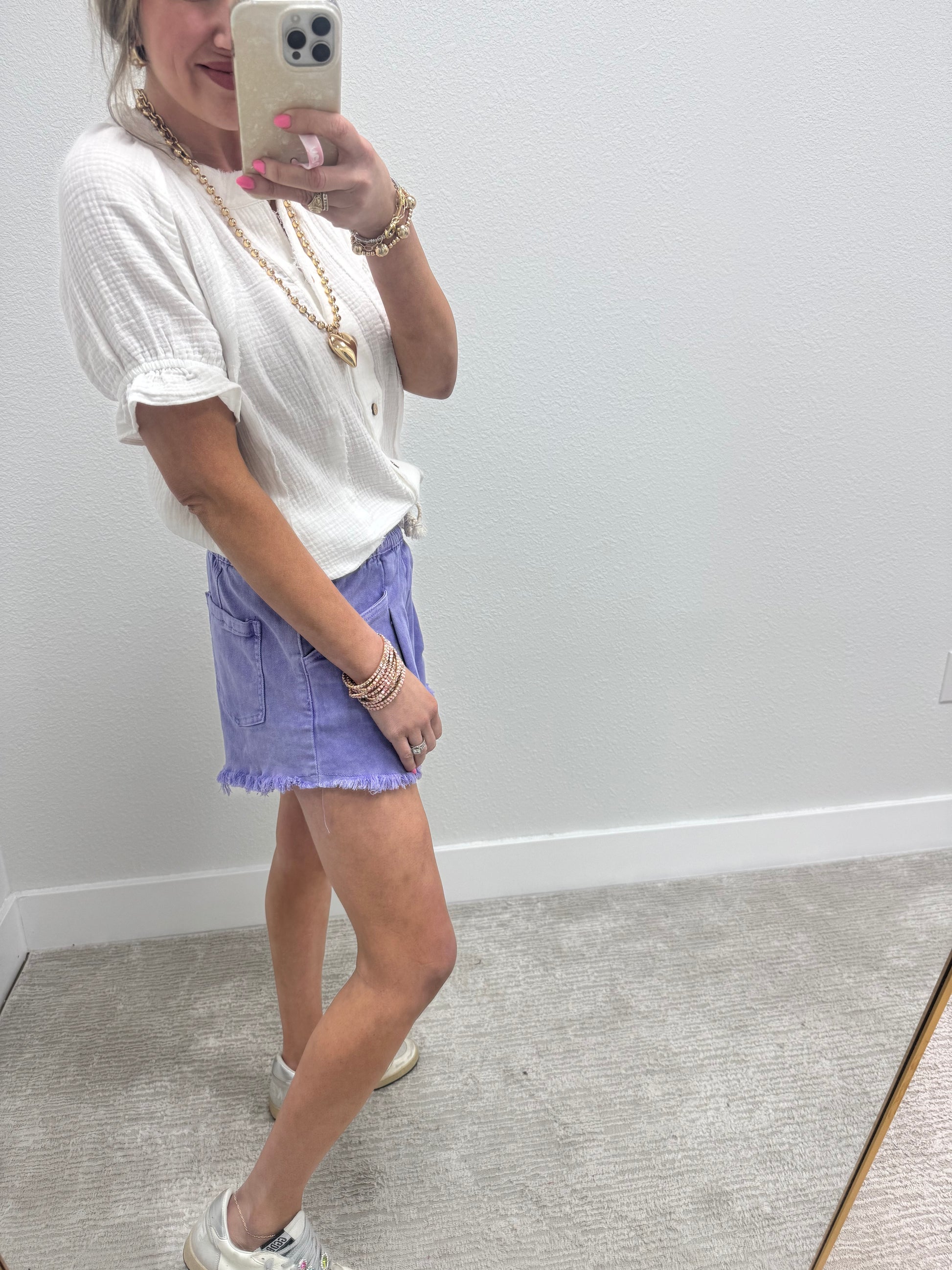 The most amazing little solid that has the cutest details, it has raw edges all down the shirt and cute little slits on the side. These have no stretch and are a relaxed TTS fit. Macy is a 2/4 and 5'7 wearing the small
