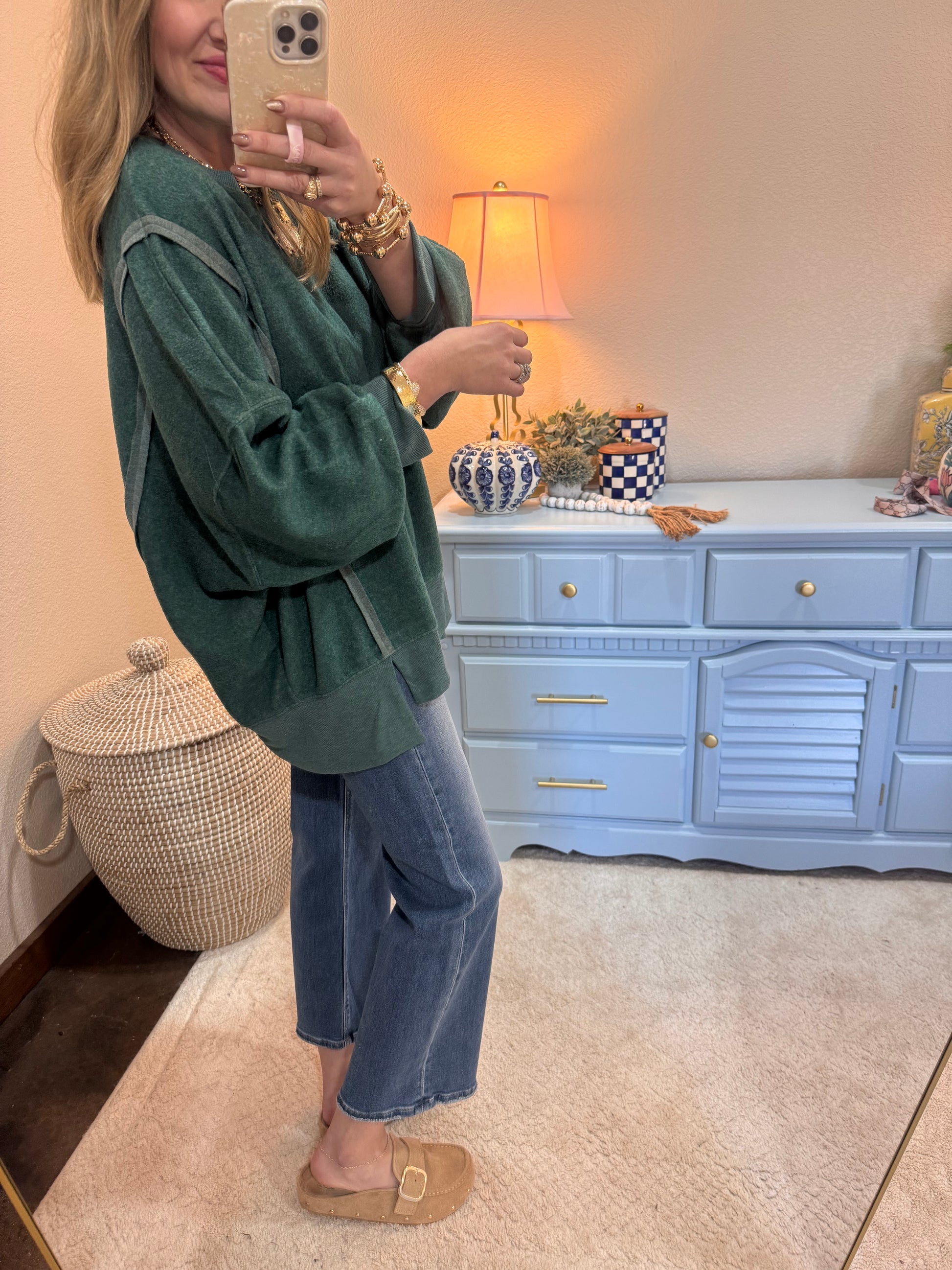 Our best seller is back!! An identical lookalike to FP and the cutest fit, oversized, cute split hems, and exposed seams. Macy is a 2/4 and 5’7 wearing the small
