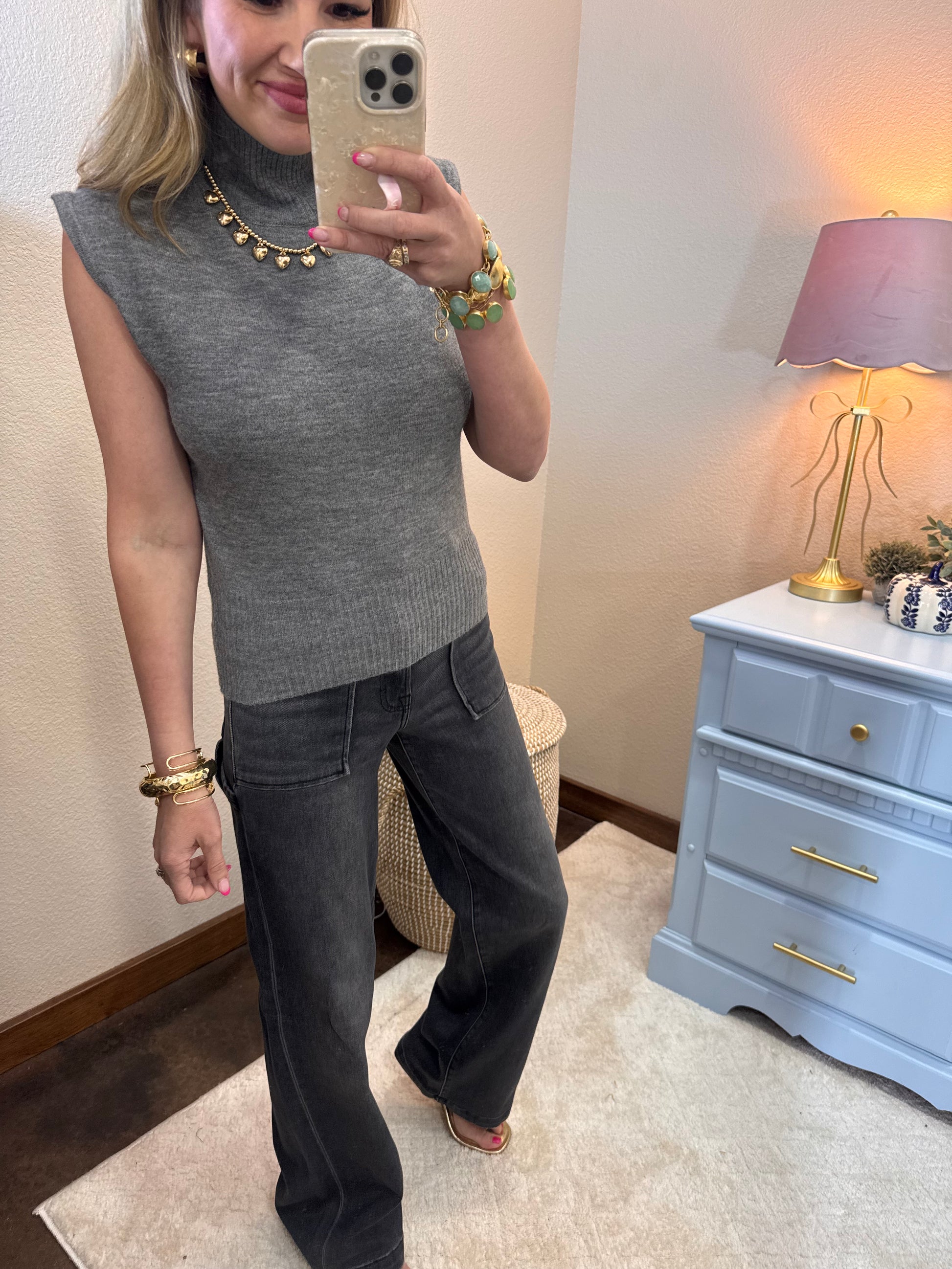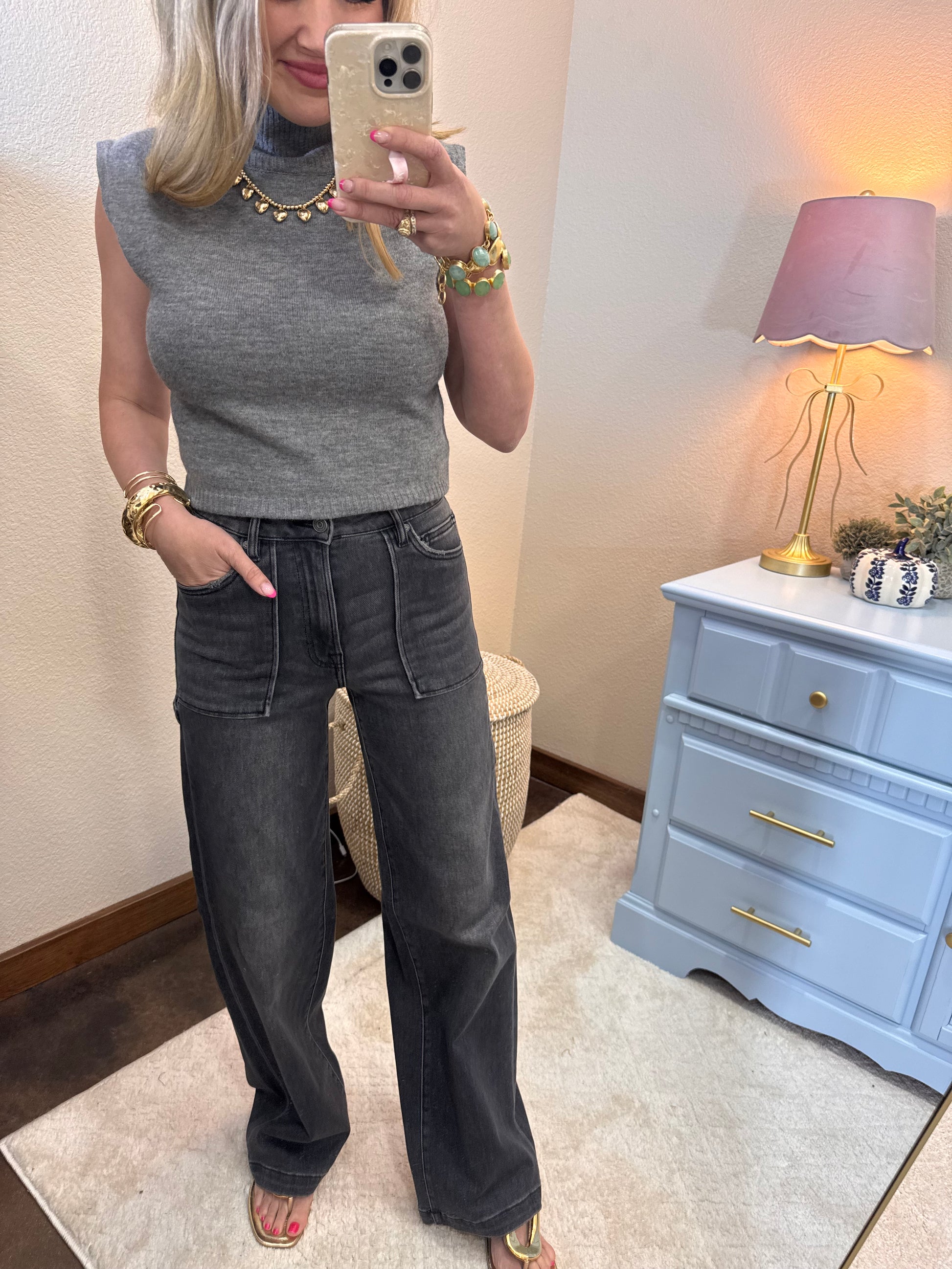 The cutest and most amazing pair of jeans from Hidden, one of our Favorite brands! They are a cute gray/black, a super soft denim, and a cute carpenter style wide leg fit. These are a TTS fit with some stretch, Macy is a 24 or 25 in pants and 5'7 wearing the 24. They are a high rise and approx a 32" inseam. 93% cotton, 5% Poly, 2% Spandex.