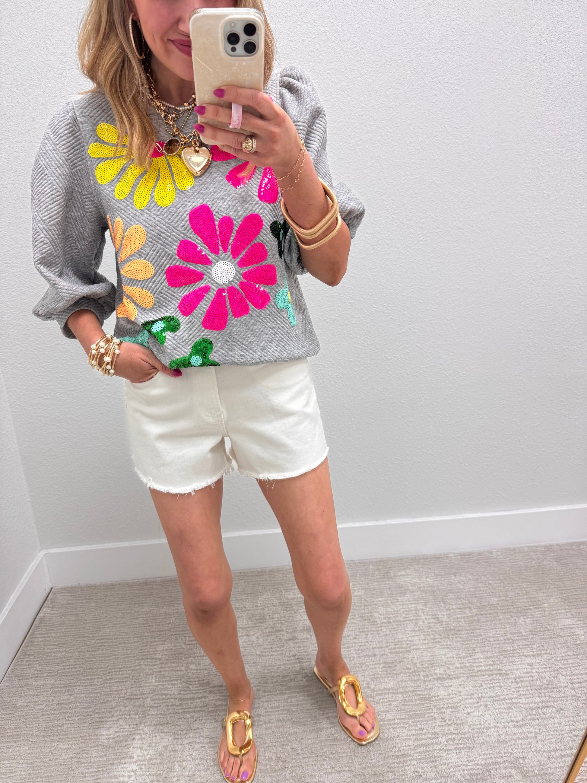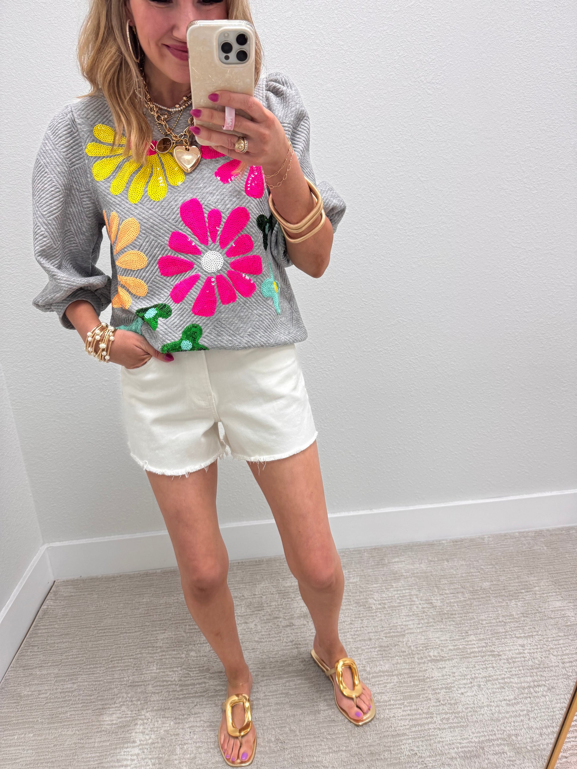 Our best selling flower sequin top is back!! It is THE cutest shirt!! The best quilted material and a the perfect little puff sleeve. These are a TTS fit with no stretch, Macy is a 2/4 and 5'7 wearing the small