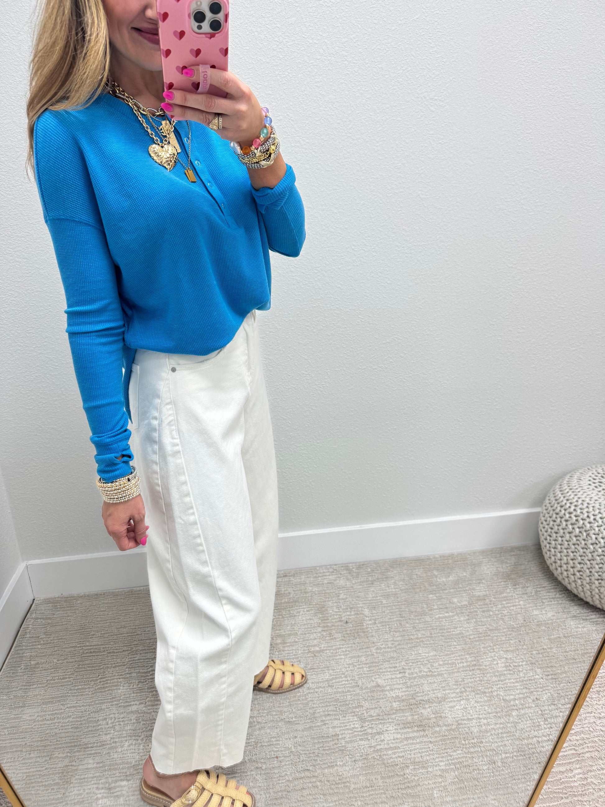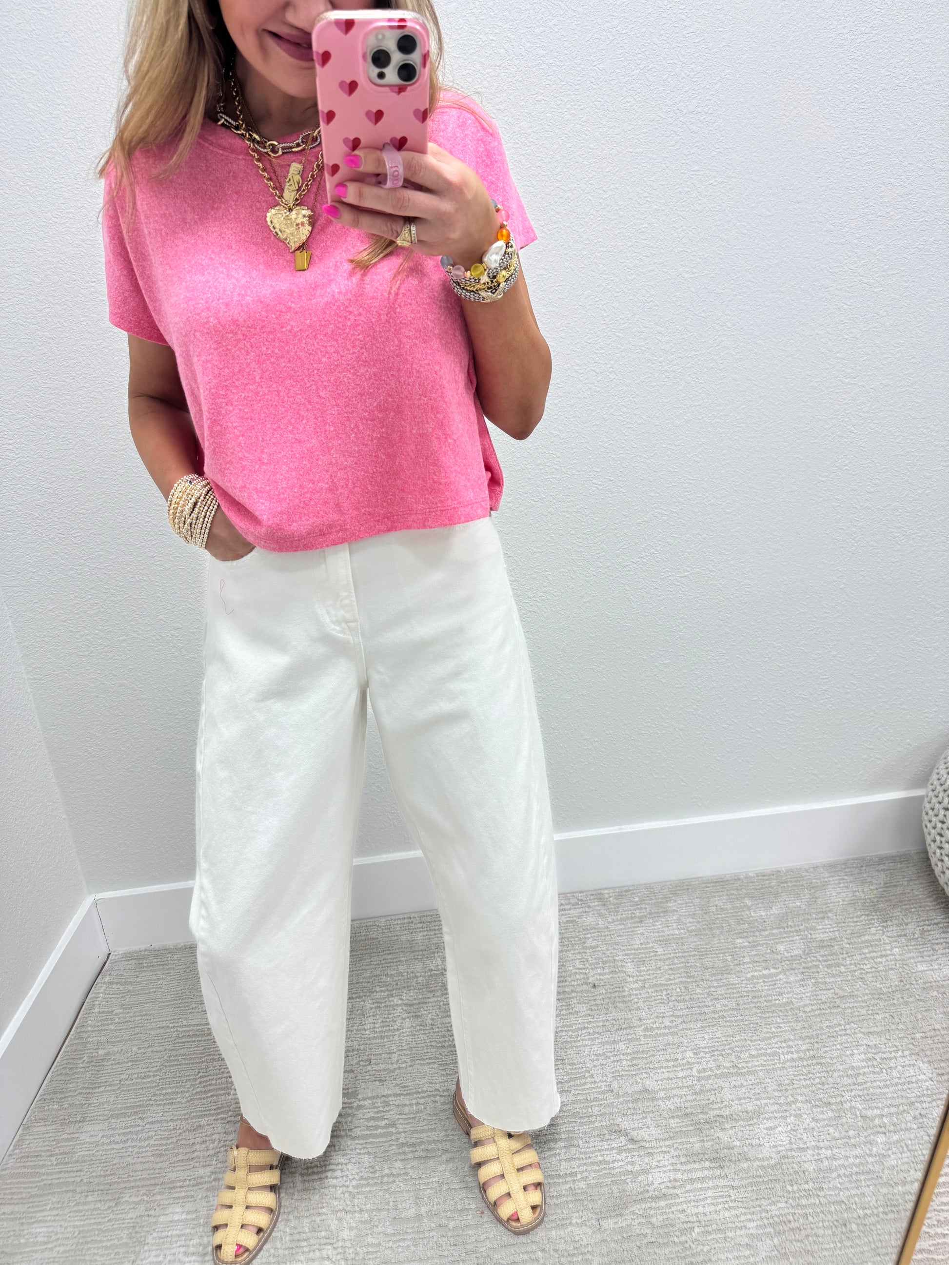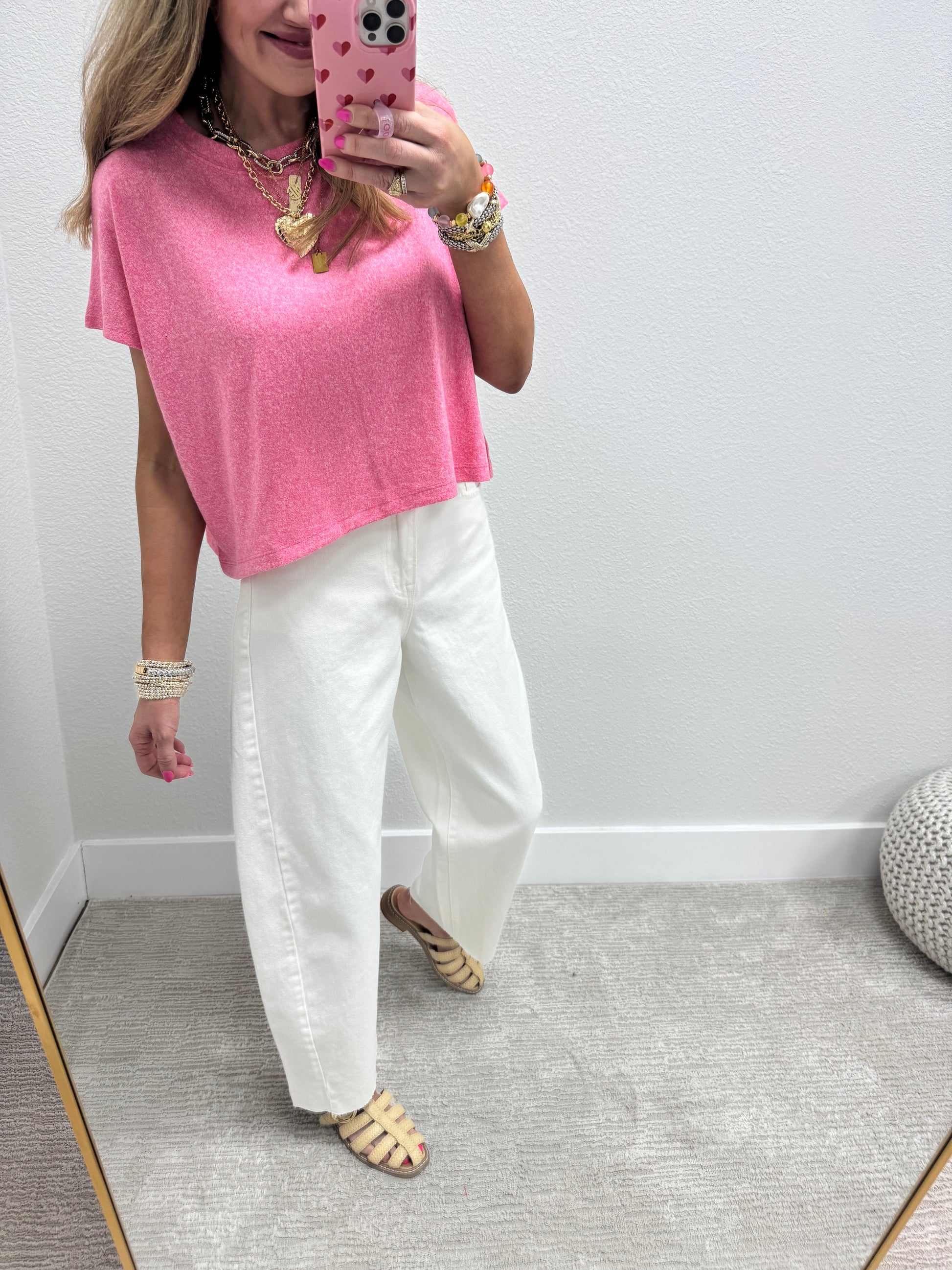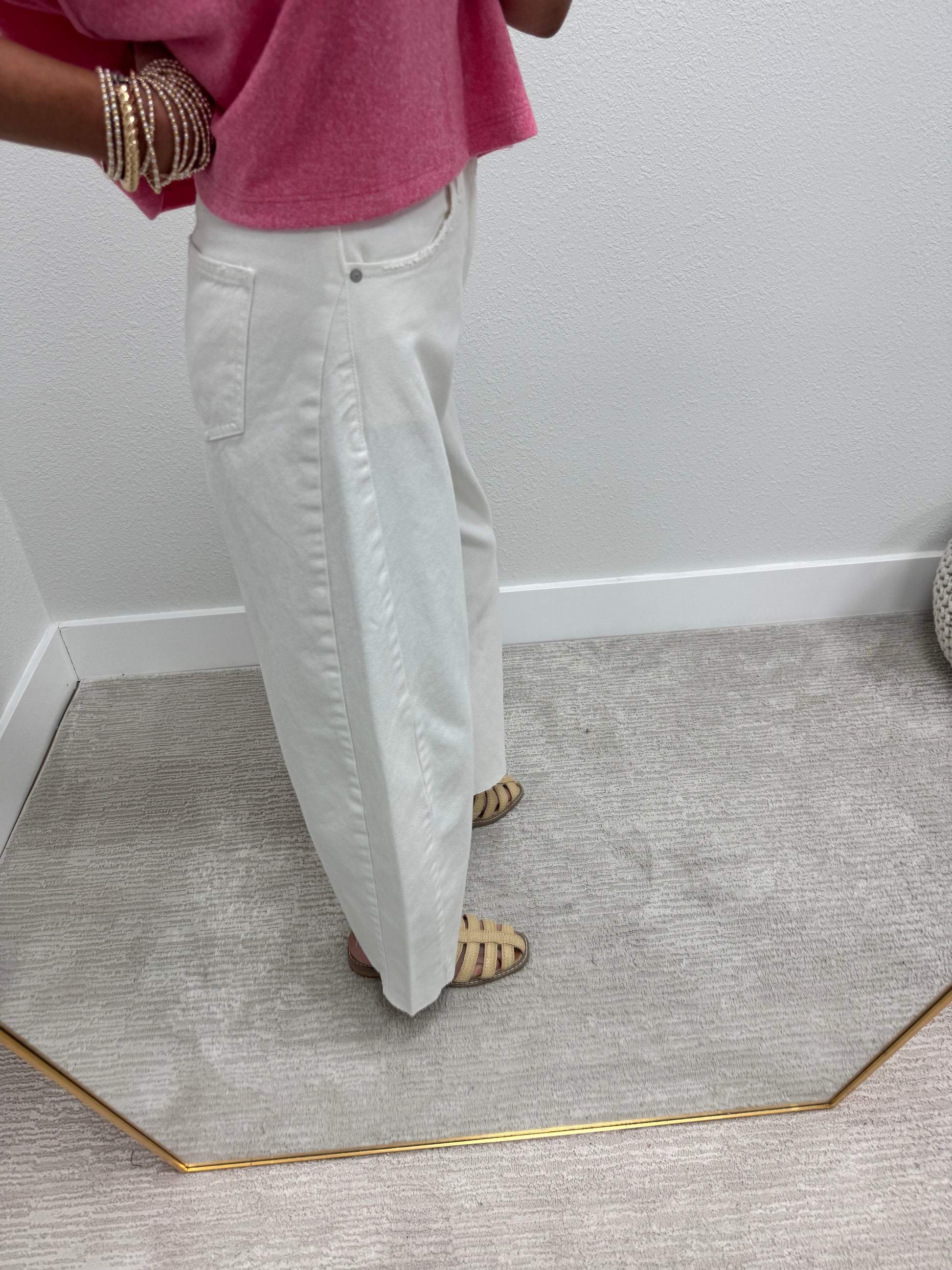 We have been anticipating these since the day we found them at market! The most amazing white barrel. They are a TTS fit with no stretch. Macy is a 24 or 25 in pants wearing the 24 here and they are fitted in the waist. She is 5’7