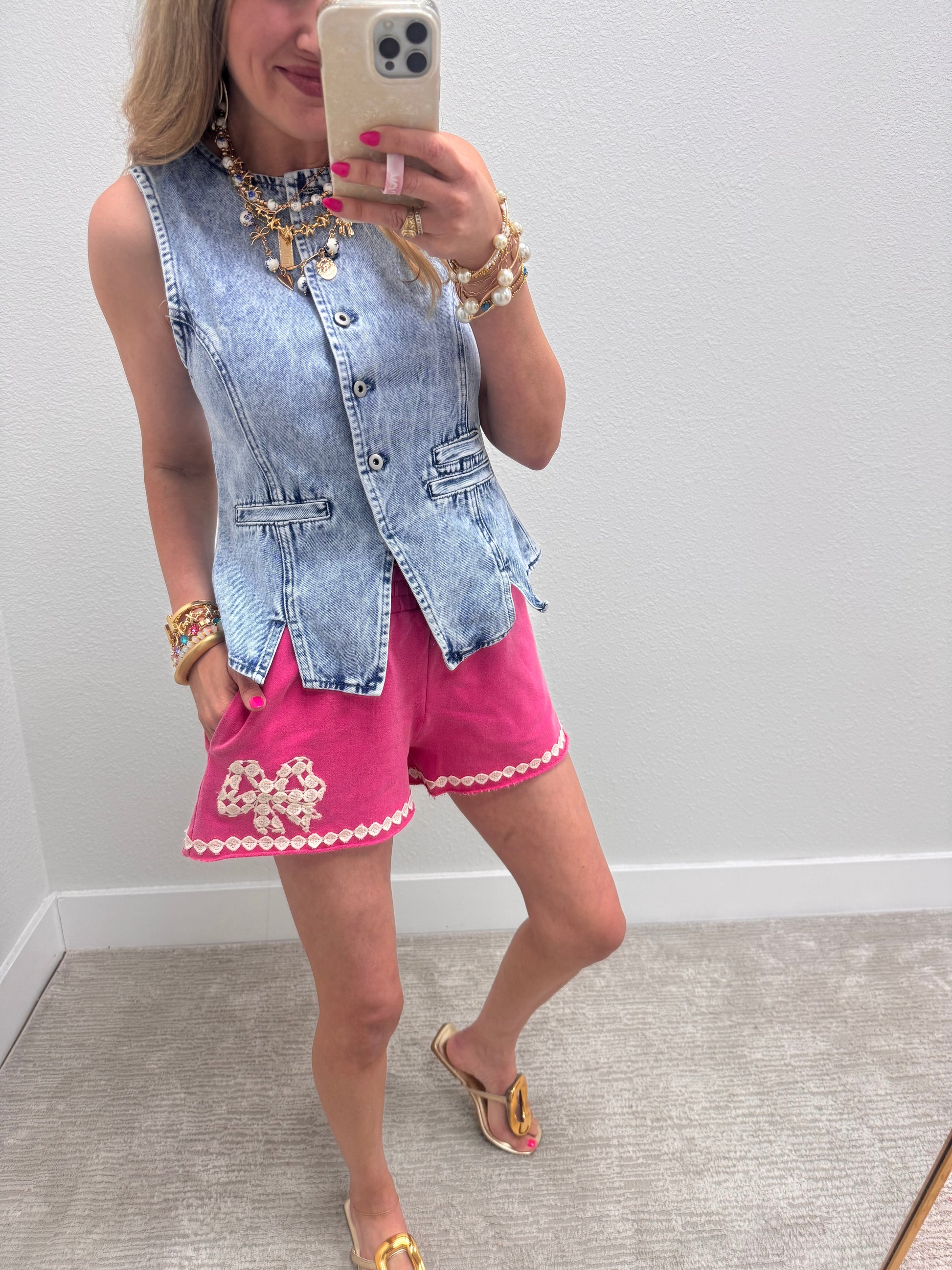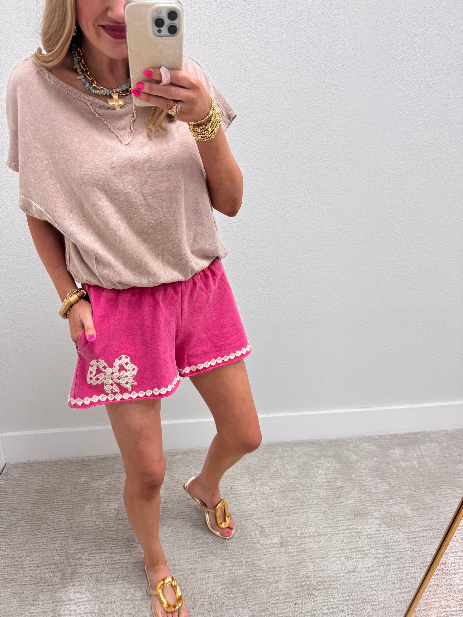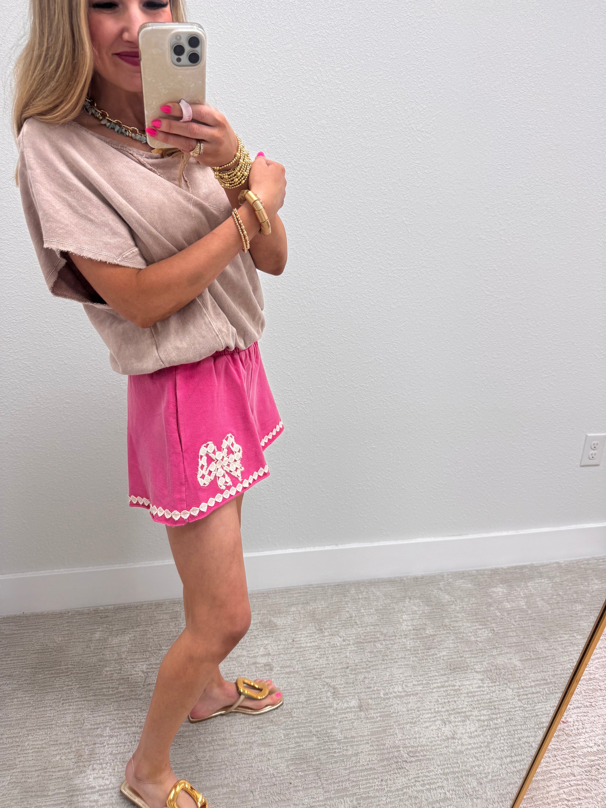 Hot Pink Mineral Wash Shorts with Ribbon Accents