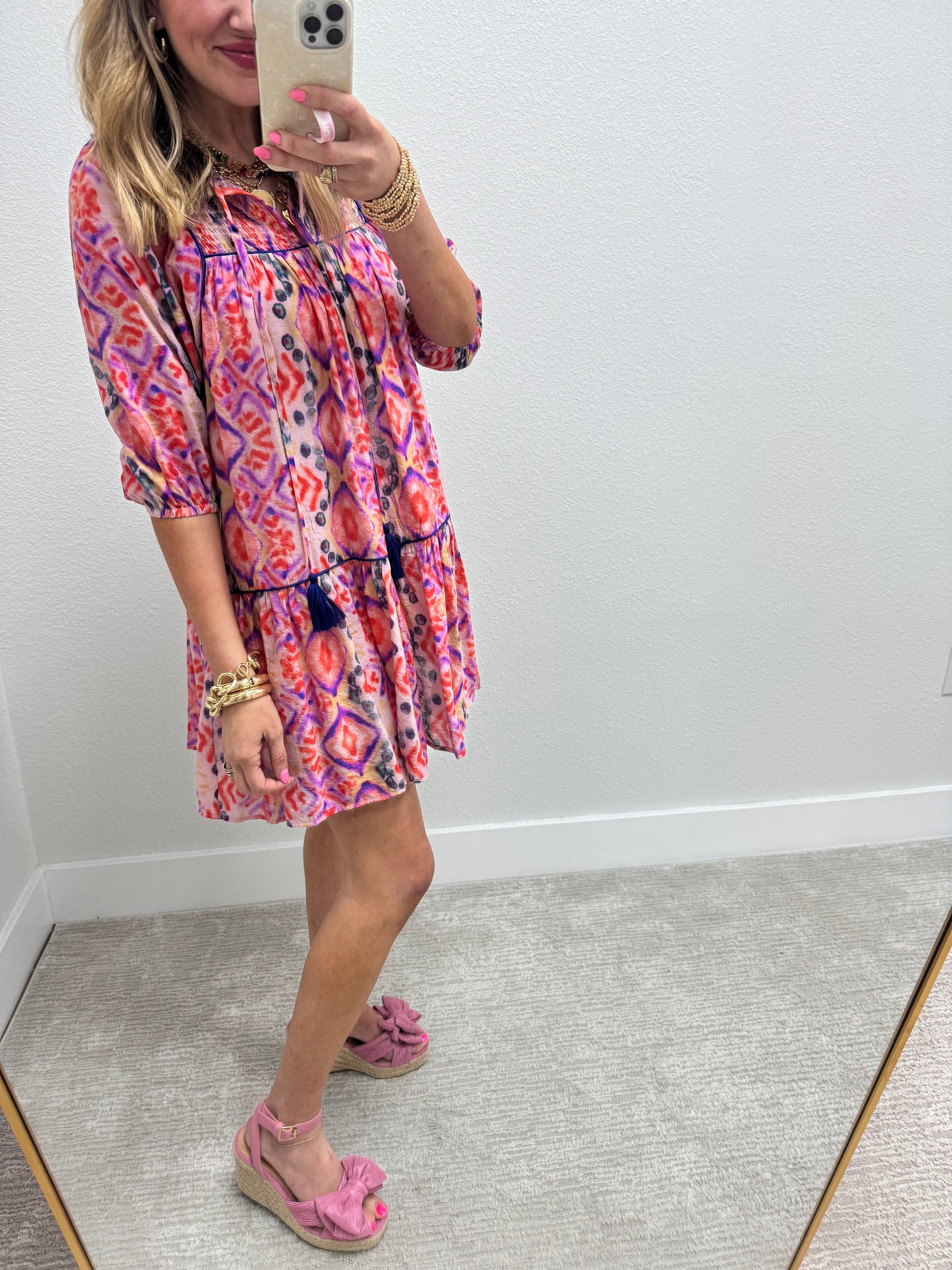 cutest little dress with the smocked top and tassels and I love the fit, slightly longer in the back than the front and fully lined, just a cute and easy dress. Relaxed fit and lined, Macy is a 2/4 and 5’7 wearing the small
