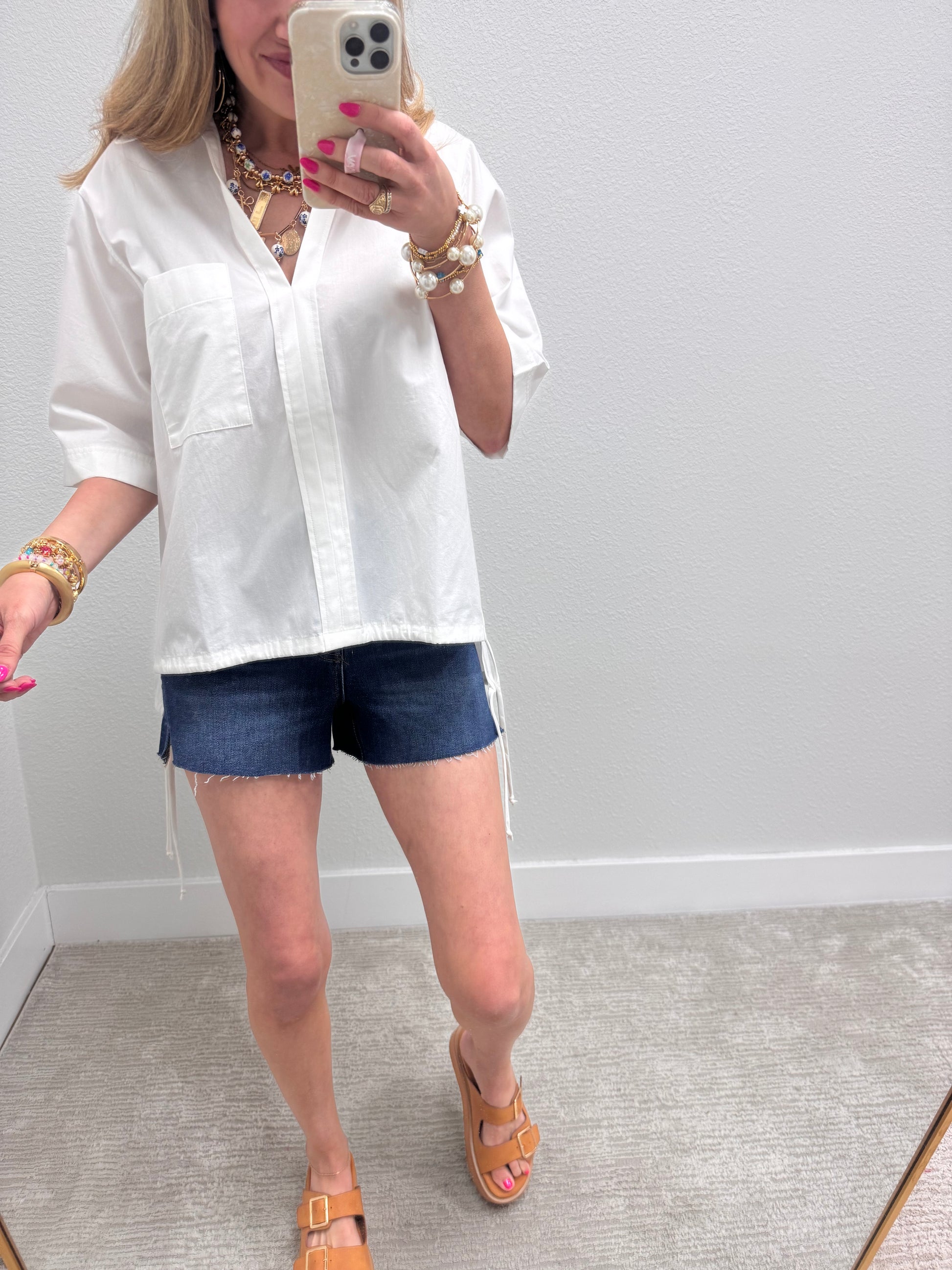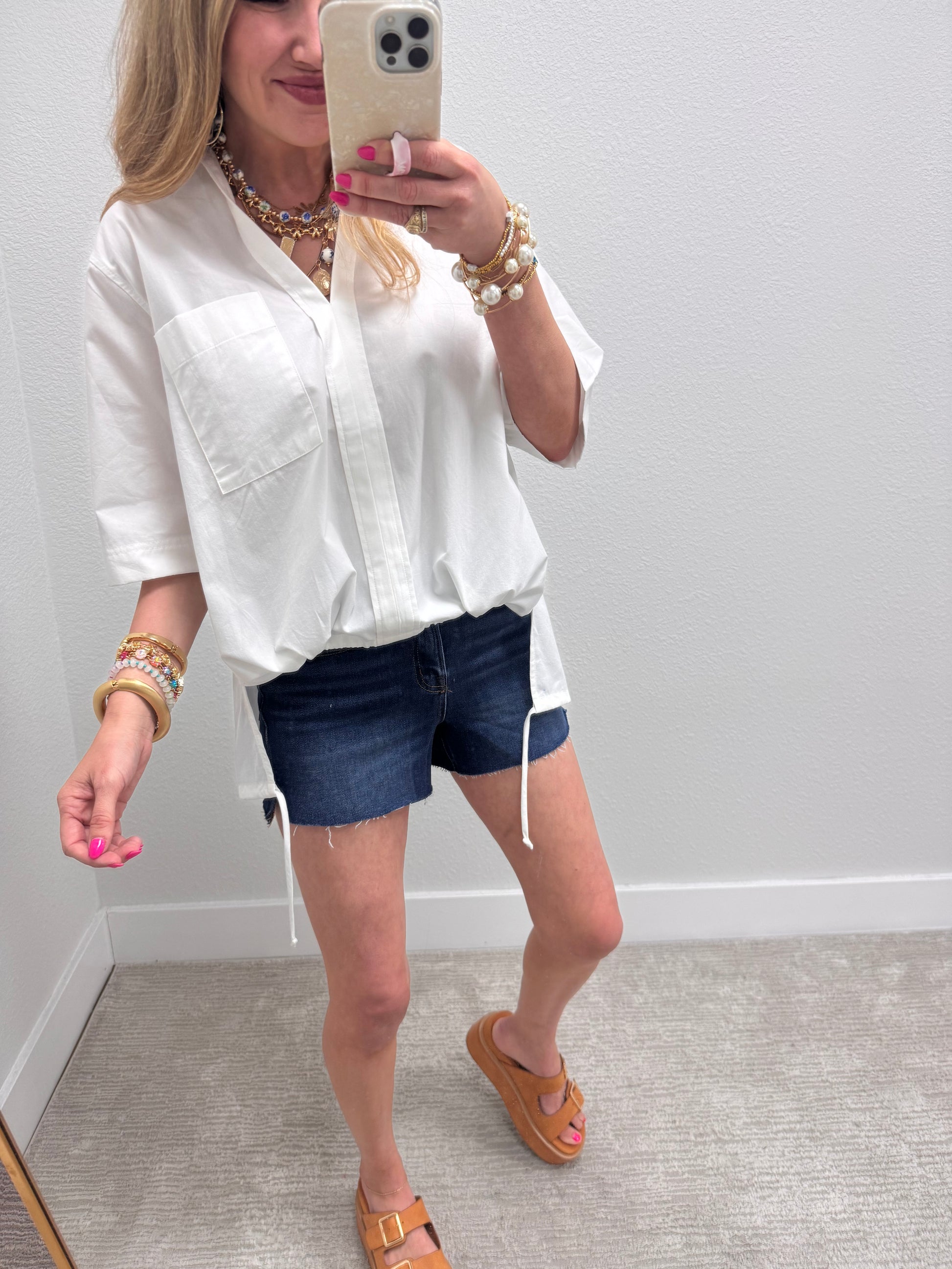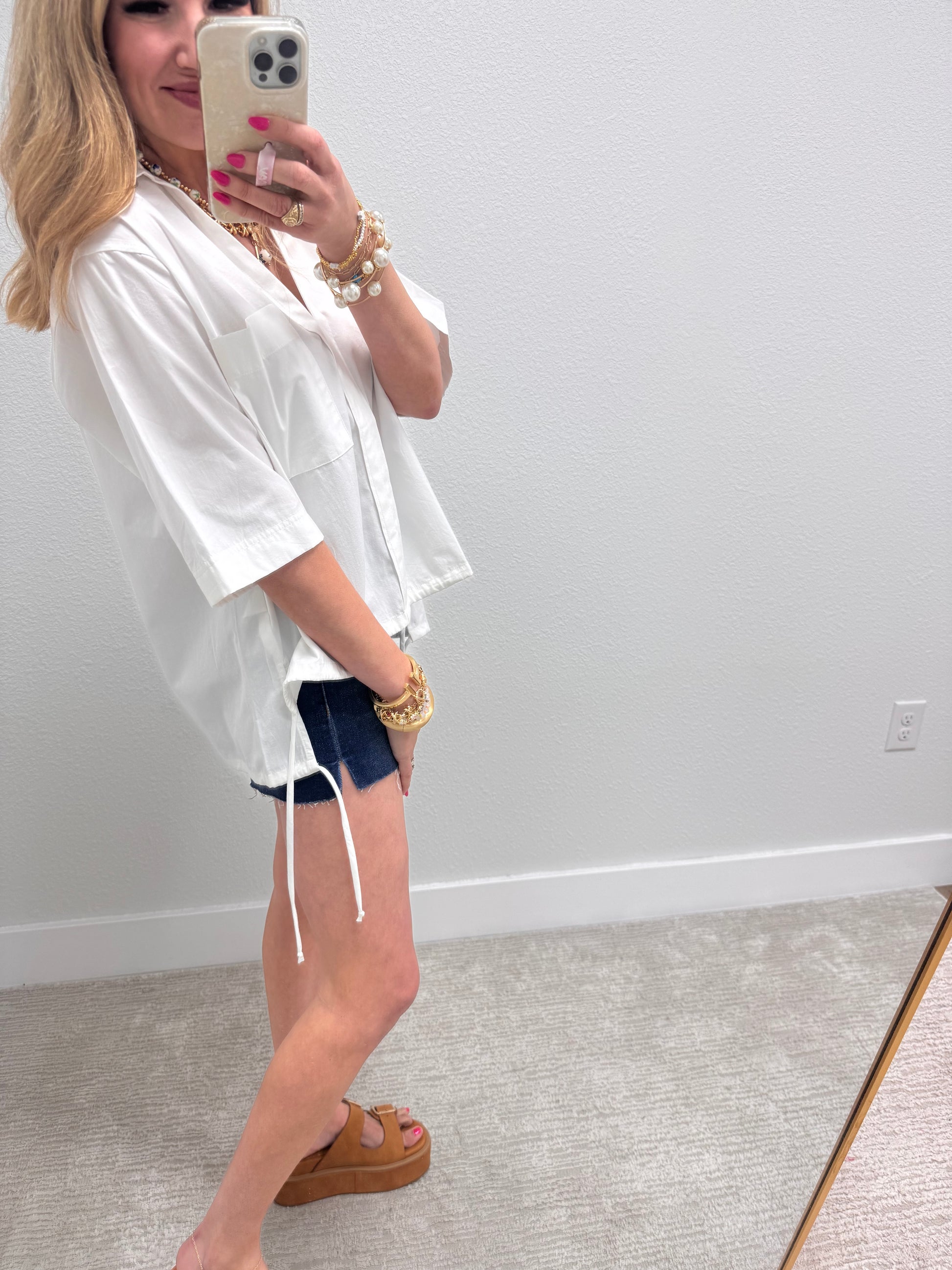 These are THE best tops!! Simple, but so cute… they are cotton so there is no stretch but they are a roomy fit and the ties are adjustable. Macy is a 2/4 and 5’7 wearing the small