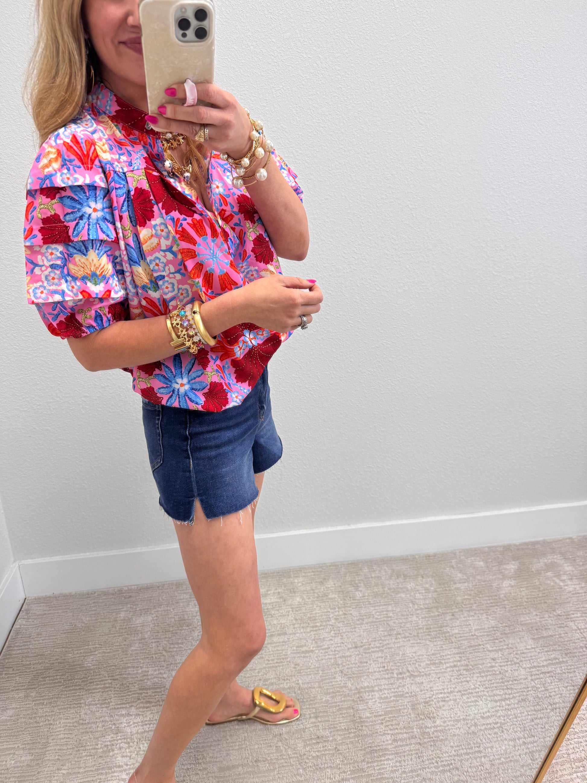 Such a cute short and they have stretch!!! 93% cotton, 5% Polyester, 2% Spandex. They are a high rise with approx a 3.75" inseam. Macy is a 2/4 of a 24 of 25 in pants and she can do the XS or small, the small is just more like a boyfriend fit and the XS is a TTS fit. The first 6 pictures she is wearing the XS and the remaining pictures she is wearing the small to show you the comparison. She is 5’7 for height reference