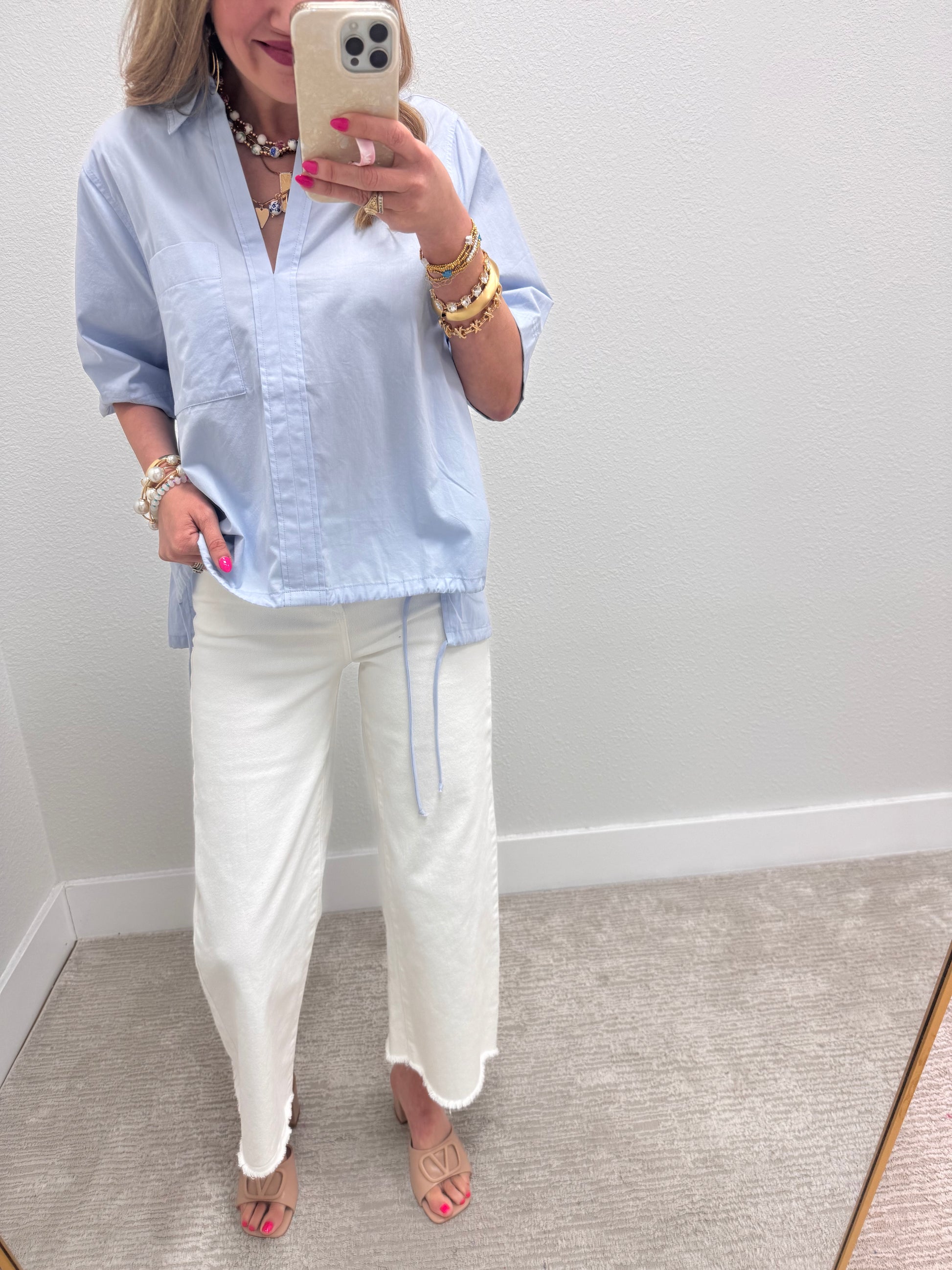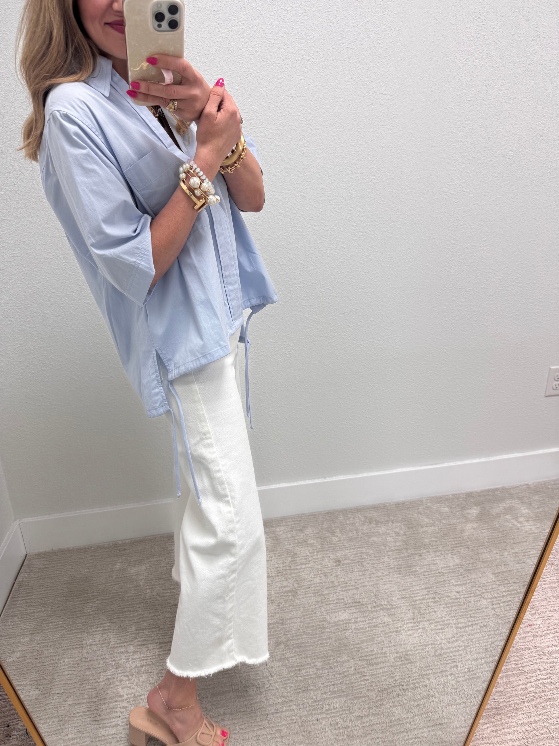 These are THE best tops!! Simple, but so cute… they are cotton so there is no stretch but they are a roomy fit and the ties are adjustable. Macy is a 2/4 and 5’7 wearing the small