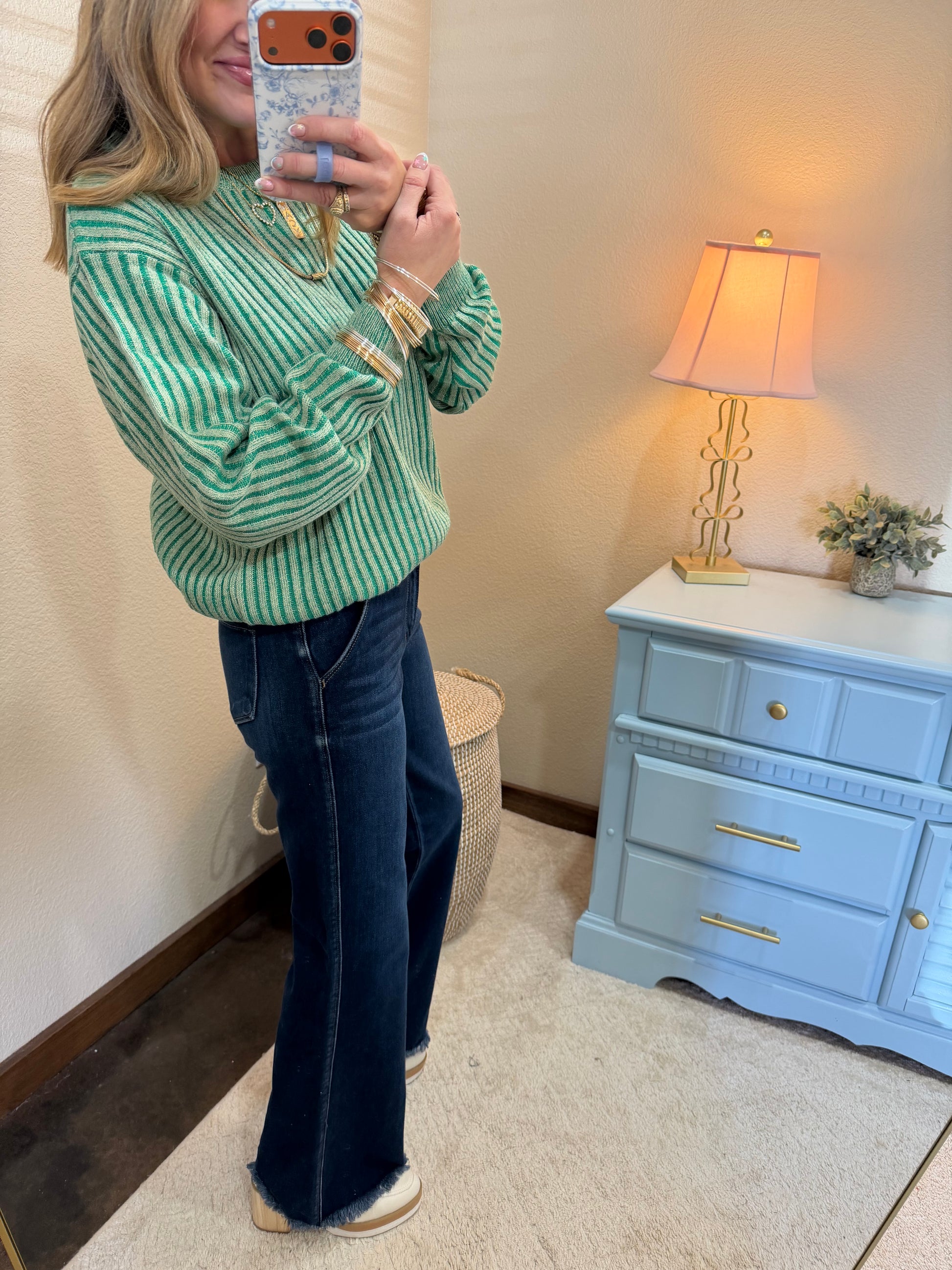 We die over these new Kancans!! I love these because they are a bootcut but have cute trouser pockets! A really nice fit and great wash of denim, they have stretch but are on the more fitted side!