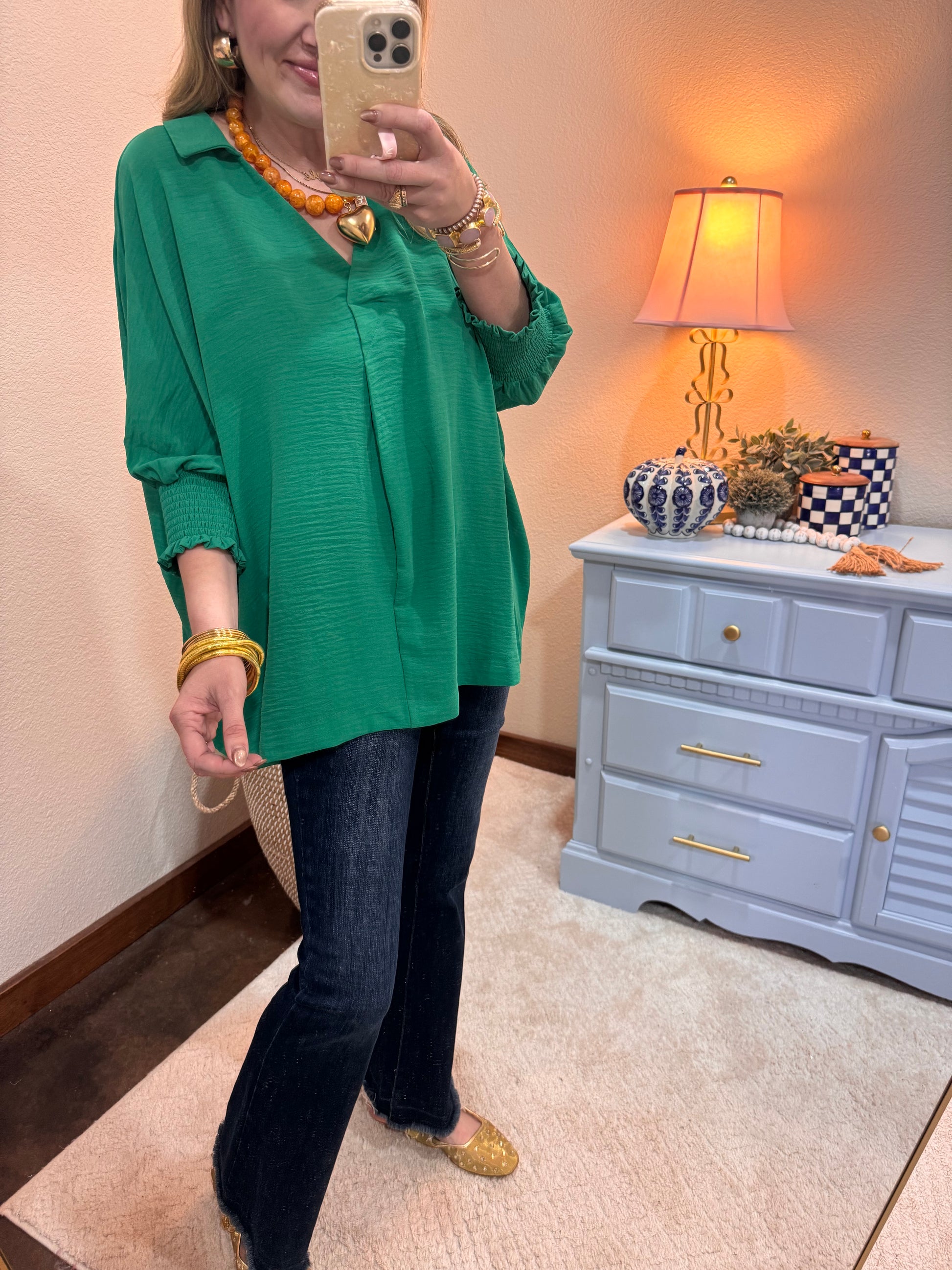 Kelly Green Collared Smocked Sleeve Top