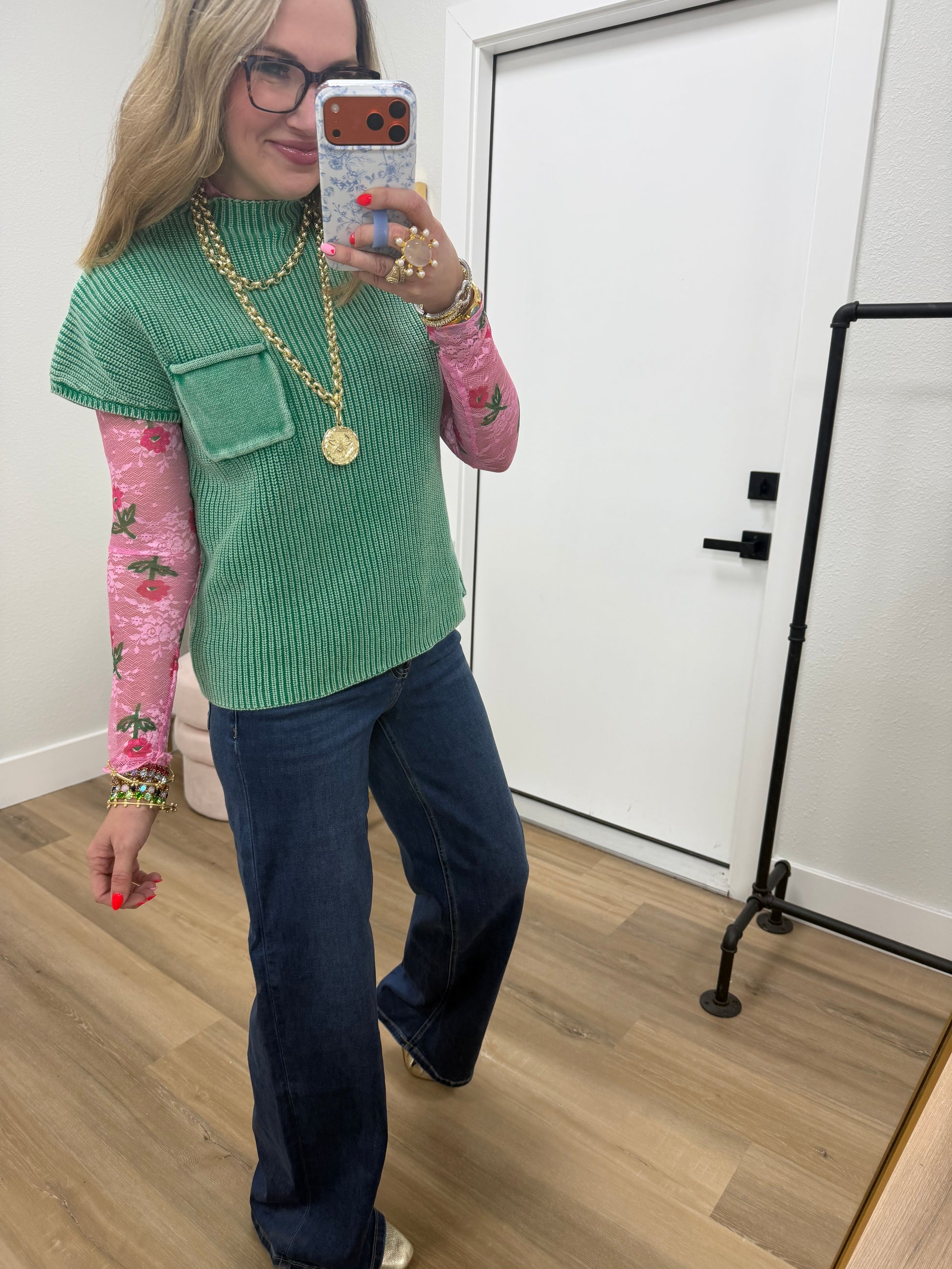 Kelly Green Solid High Neck Short Sleeve Sweater Top