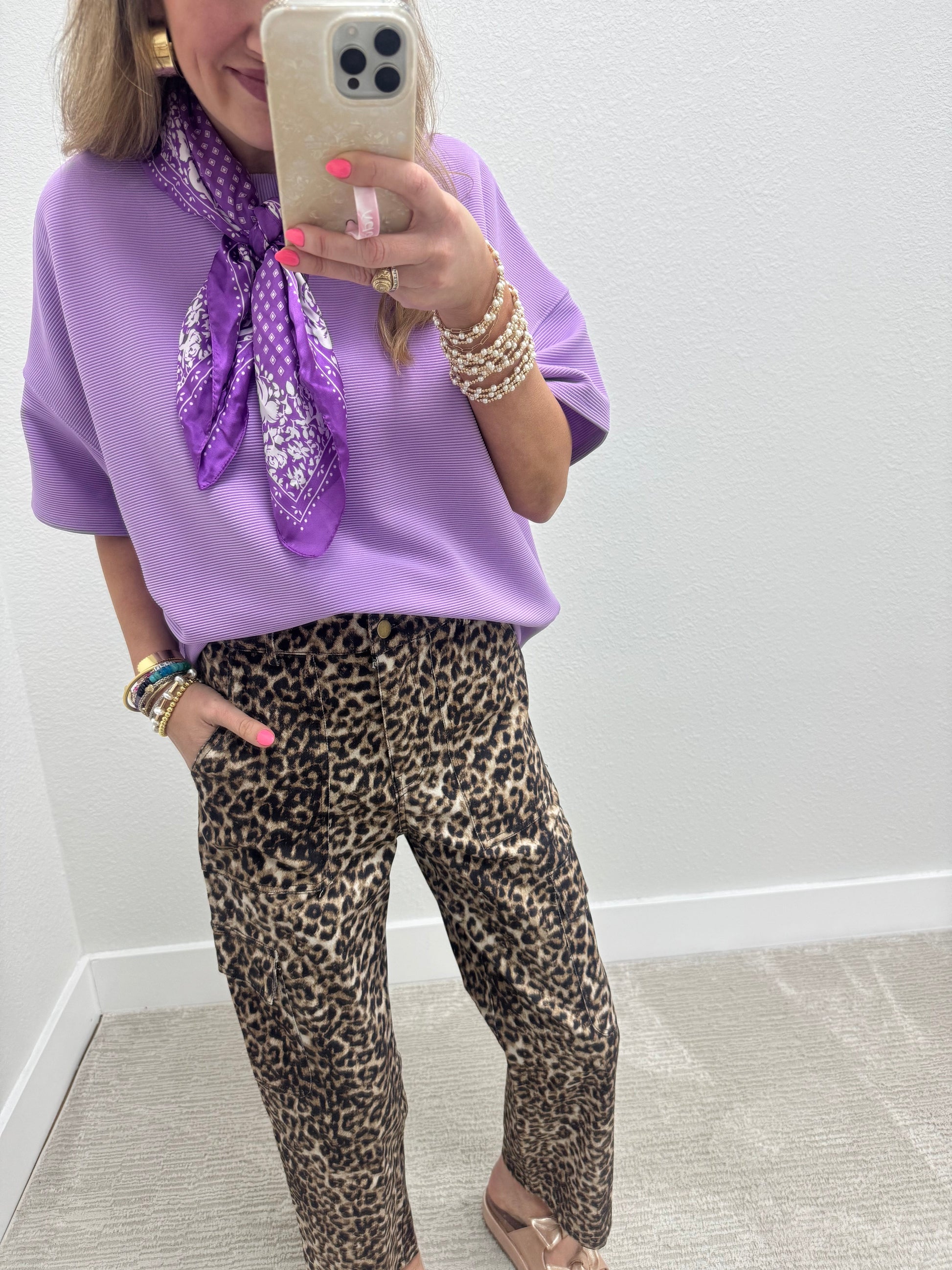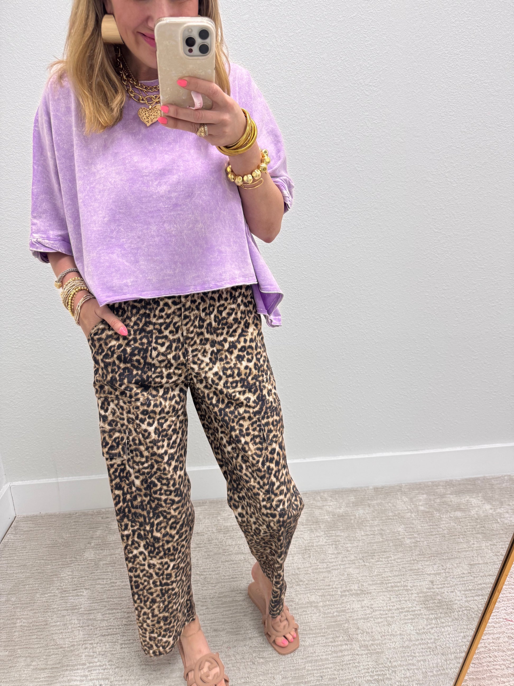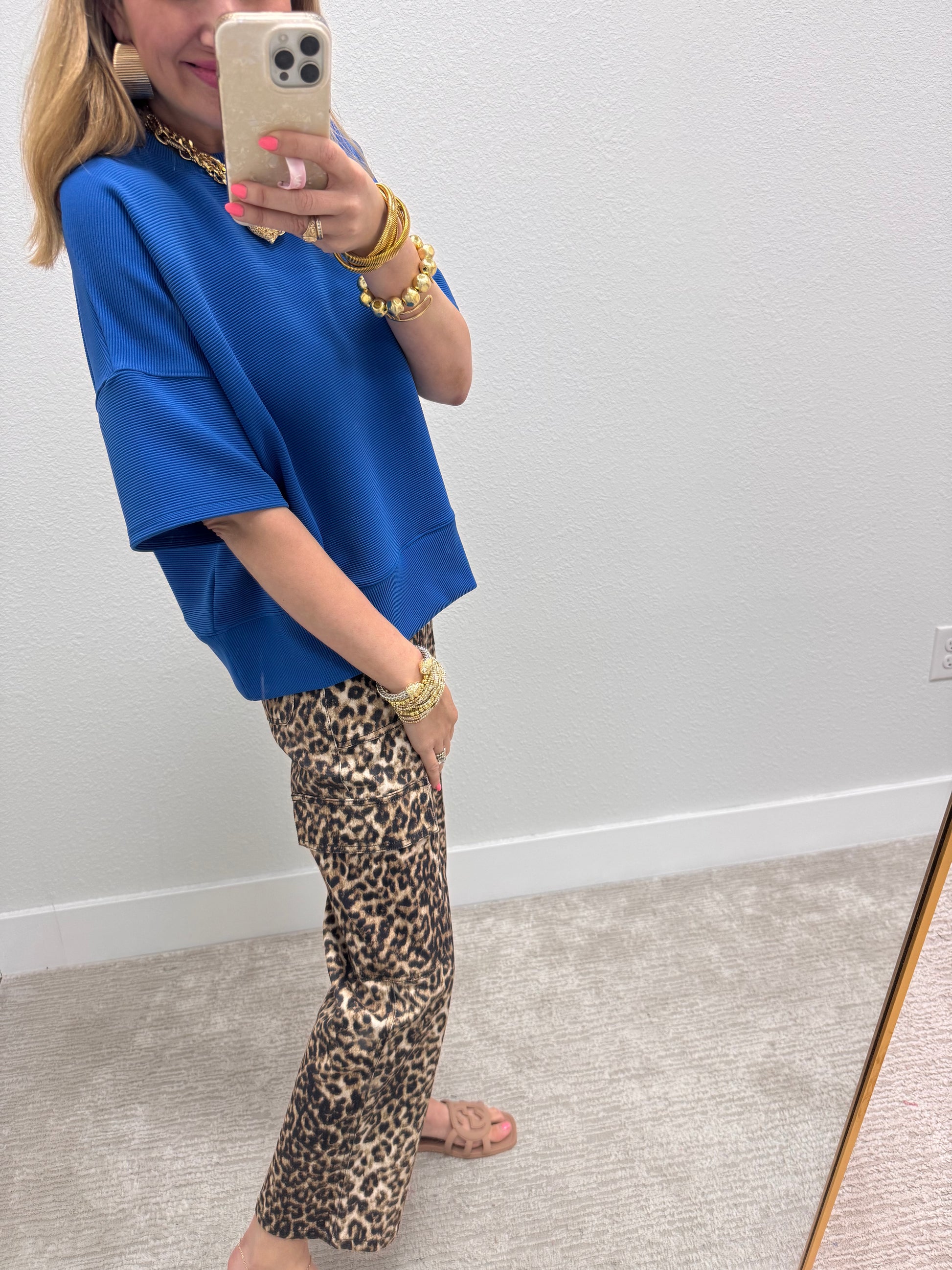 The BEST pair of leopard pants... they are jeans with a regular button in the front, but they have elastic in the back!! So darn cute and a pair you will wear over and over. These are a relaxed fit, Macy is a 24/25 in pants wearing the size small with some room. We suggest size 25/26/27 small, 28/29 Medium, 30/31 Large, she is 5/7
